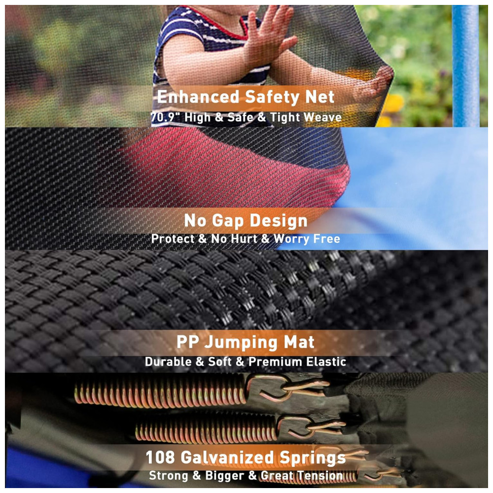 Experiência de salto superior108 molas de trampolim galvanizadas resistentes à ferrugem prendem com segurança o tapete de salto e a estrutura firmemente entrelaçados, oferecendo um salto superior e impressionante. O tapete de salto é feito de material PP com propriedade de elasticidade premium, permitindo que as crianças pulem mais alto e mais alegres.