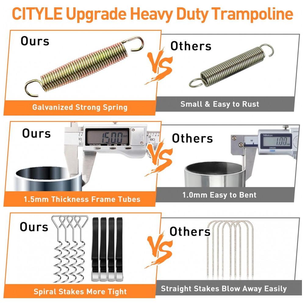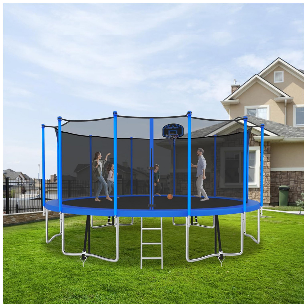 Segurança em primeiro lugarO trampolim de 4,88 metros é equipado com 12 postes de gabinete de alta segurança e construção de aço resistente à ferrugem galvanizado de calibre pesado. 6 pernas em forma de W garantem estabilidade. Temos testes abrangentes da composição química do material e do design da estrutura do produto para garantir sua segurança.
