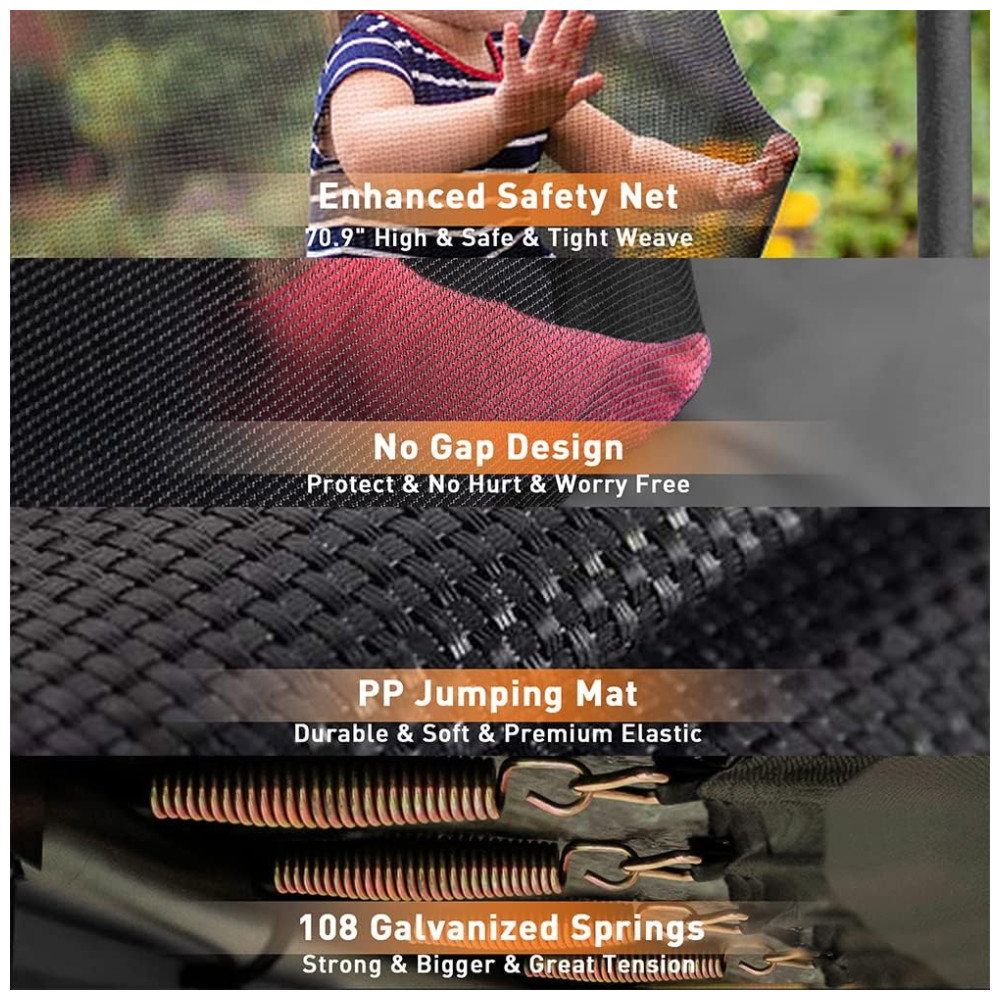 A área de salto utiliza lona em material PP de alta elasticidade, conectada ao aro por 108 molas metálicas galvanizadas, dimensionadas para oferecer retorno consistente e amortecimento uniforme. A rede de proteção perimetral é sustentada por 12 postes verticais acolchoados, formando um perímetro de segurança ao redor da superfície de salto e reduzindo o risco de quedas para fora da estrutura.