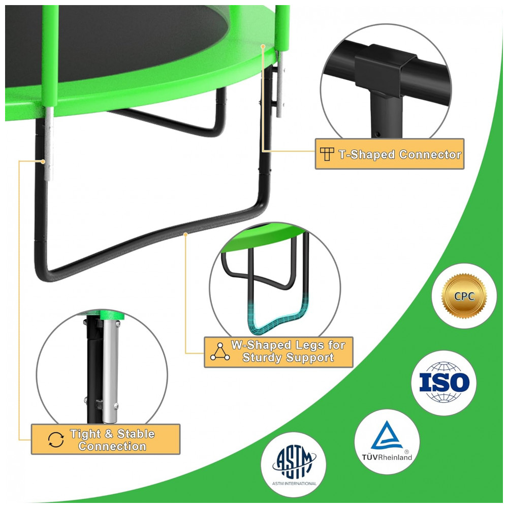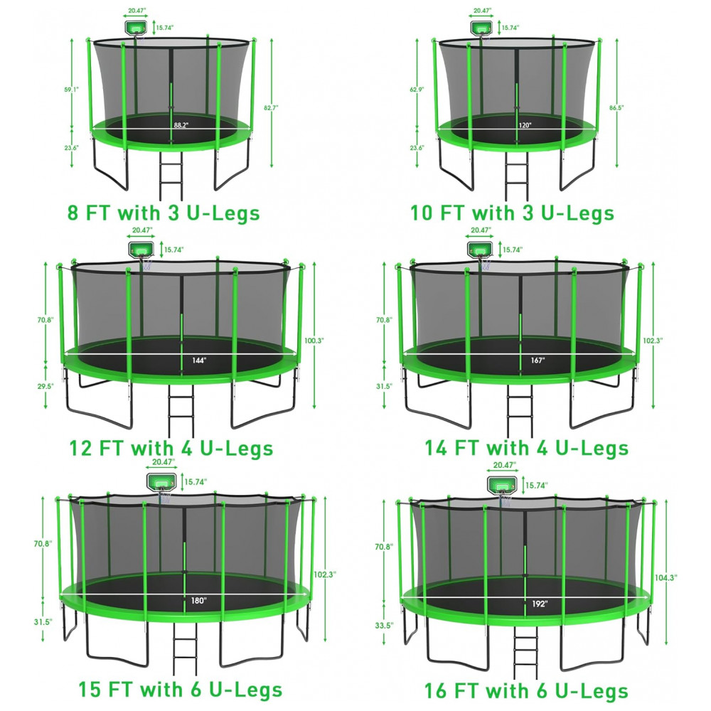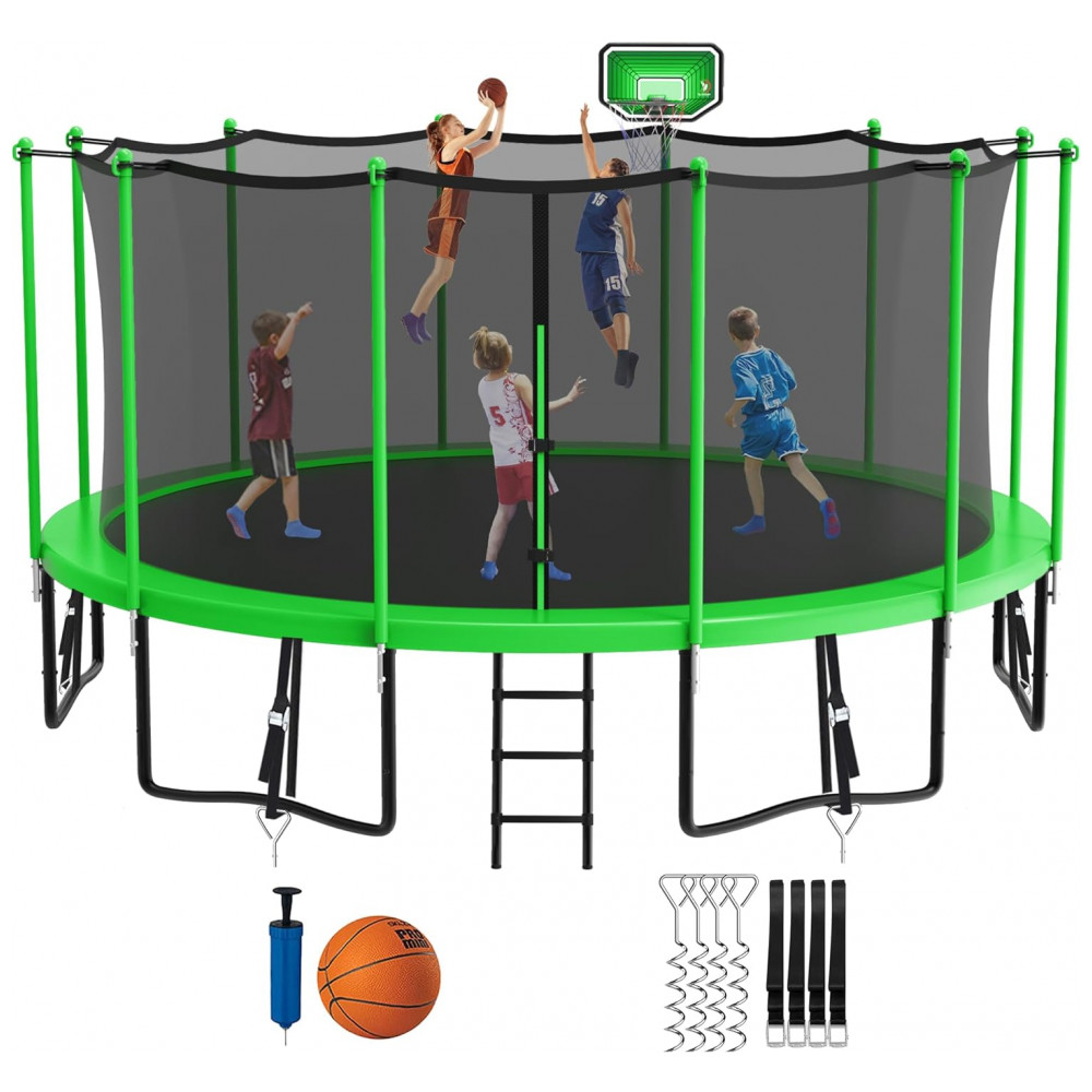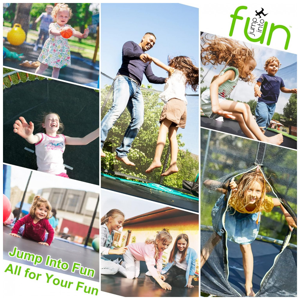 2022 Design e Tecnologia Avançados Jump Into Fun O trampolim de 15 pés com estrutura de cesta de basquete é feito de aço totalmente galvanizado e pulverizado de 1,, em comparação com outros trampolins, é mais forte, mais antiferrugem e anticorrosão e tem uma vida útil mais longa 6 pernas em forma de W com 12 pólos para maior estabilidade e segurança. As molas galvanizadas de 96 peças se estendem uniformemente ao redor do tapete de salto, o que garante um salto suave e responsivo.