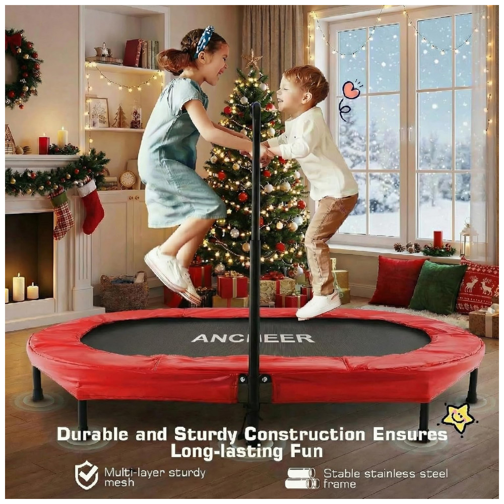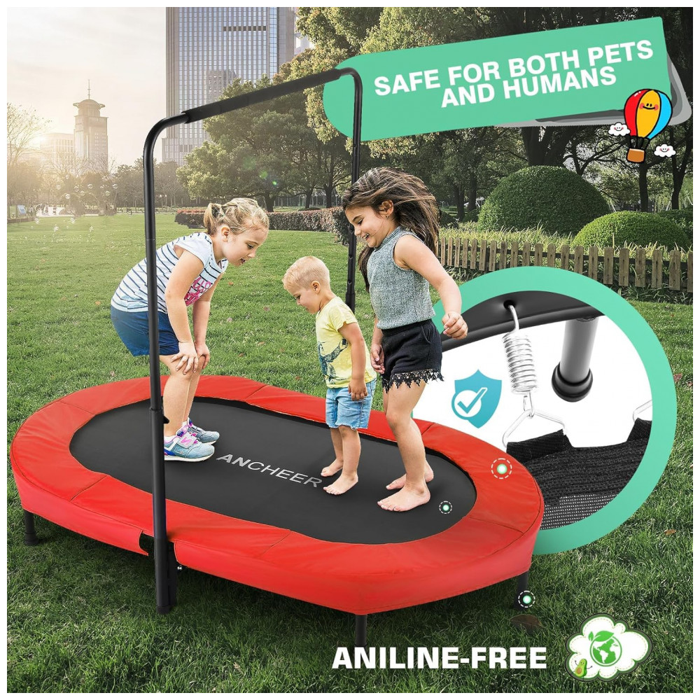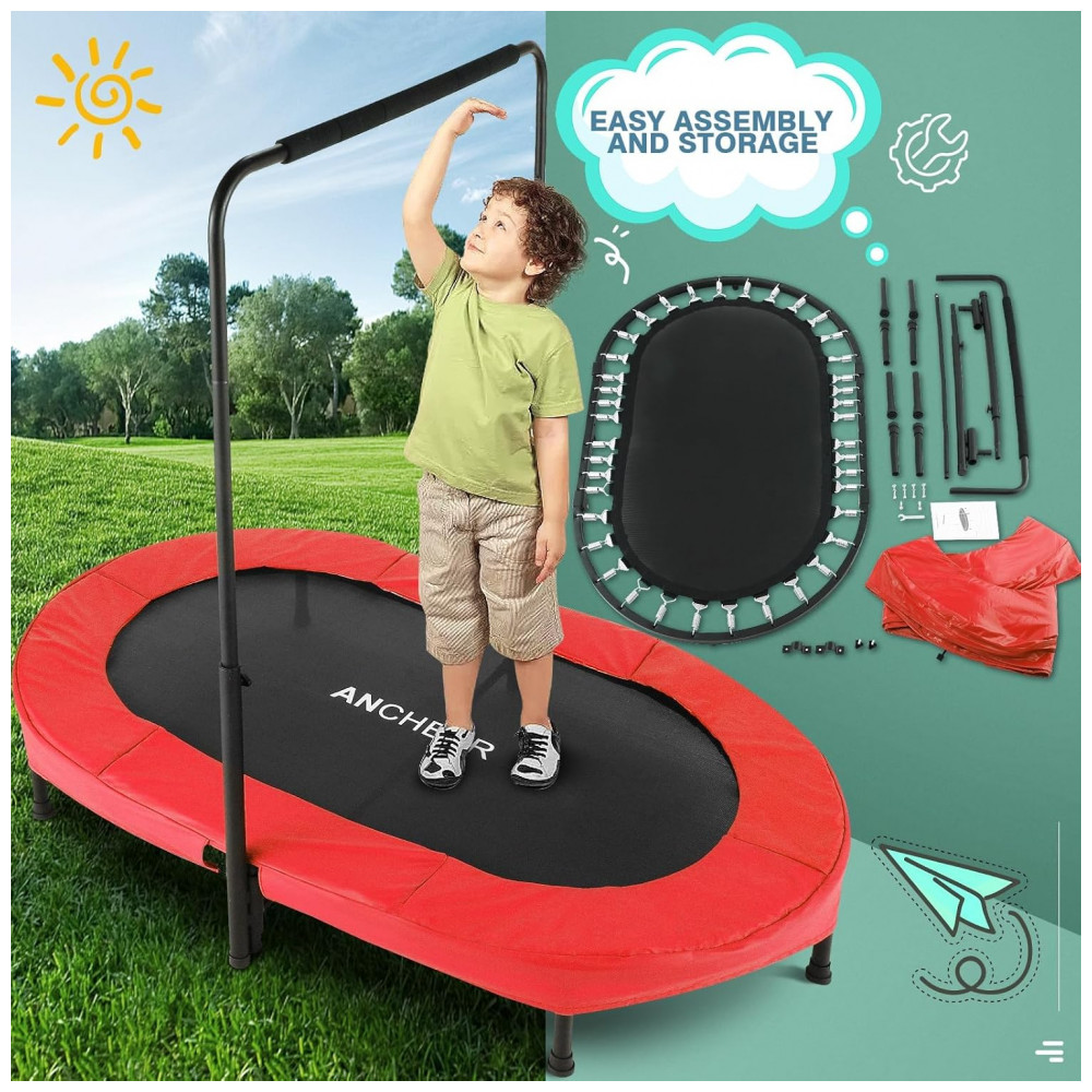 Dobrável e fácil de transportar O mini trampolim ANCHEER é projetado exclusivamente para dobrar, o que é perfeito para sala de estar, jardim, quarto, escritório ou outro espaço limitado etc. Com o design dobrável, pode ser dobrado duas ou uma vez, economizando você muito espaço de zenamento e transportar seu trampolim de um quarto para o outro será mais fácil.