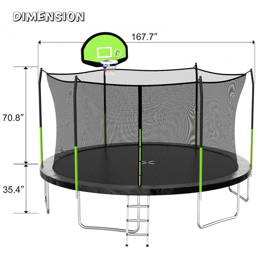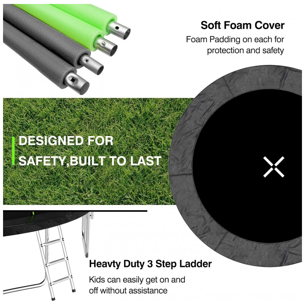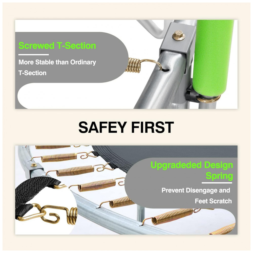 A segurança do trampolim é nossa principal prioridade ao pular alegremente. Projetamos segurança para trampolim. A almofada de salto e a cobertura da mola estão juntas para evitar que a sola do pé fique presa pela mola durante o uso. O trampolim de adota um design alargado, o que aumenta a área usada para saltar. A estrutura de aço antiferrugem engrossada e aumentada e 6 pernas grandes em forma de U com 12 pontos de contato equilibrados para aumentar a estabilidade do trampolim.