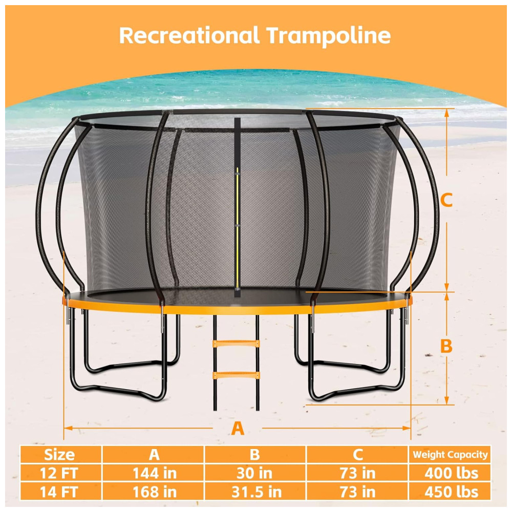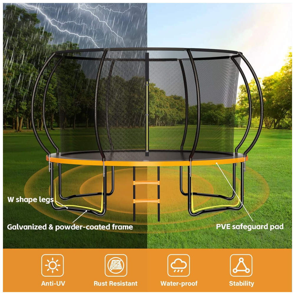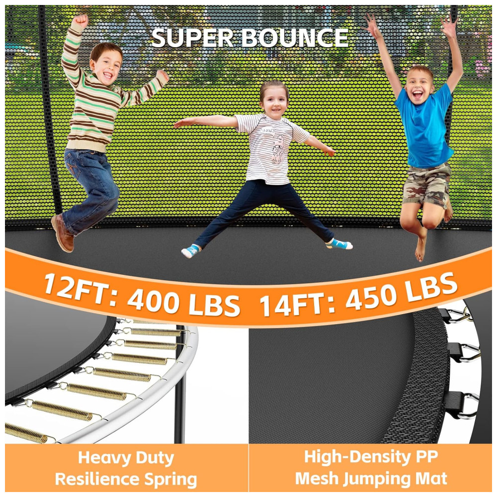 Trampolim resistente de alta capacidade de peso Com 80 molas de alta resiliência e um tapete de salto antidesgaste de alta densidade, nosso trampolim de 14 pés 4,27 metros para crianças e adultos suporta até 204,12 quilogramas. O metal resistente é galvanizado e revestido a pó para evitar ferrugem.