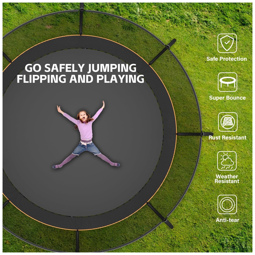 Estável Durável Apresentando 4 pernas em forma de W, 8 postes de suporte curvos e juntas em T com conexões de parafuso duplo. Nosso trampolim externo para quintal oferece uma estrutura rígida e estável.