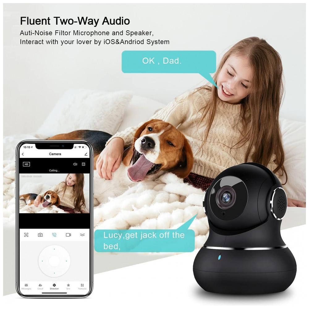Áudio de 2 vias fluente e visão manual à noite Microfone e alto falante embutidos, você pode manter contato com seu bebê , animal de estimação , babá em qualquer lugar, a qualquer momento entre o pequeno aplicativo inteligente e os lados da câmera do cão, basta pressionar o botão de chamada. Com o interruptor IR Cut inteligente, a câmera inteligente Little elf mudará automaticamente para o modo dia , noite, de acordo com as mudanças de luz. Você também pode ativá lo ou desativá lo manualmente, como quiser, a distância da visão noturna é de até 33 pés no escuro.