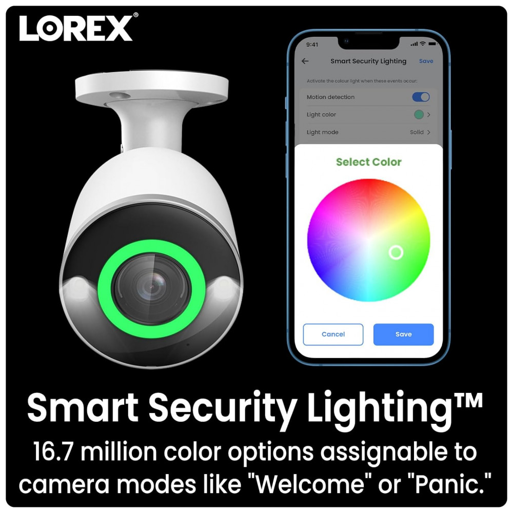 Personalize as cores da luz com a iluminação de segurança inteligente A faixa de luz LED inteligente personalizável vem com 16,7 milhões de opções de cores para escolher. As cores podem ser atribuídas a modos de câmera predefinidos, como o modo Bem vindo ou Pânico.