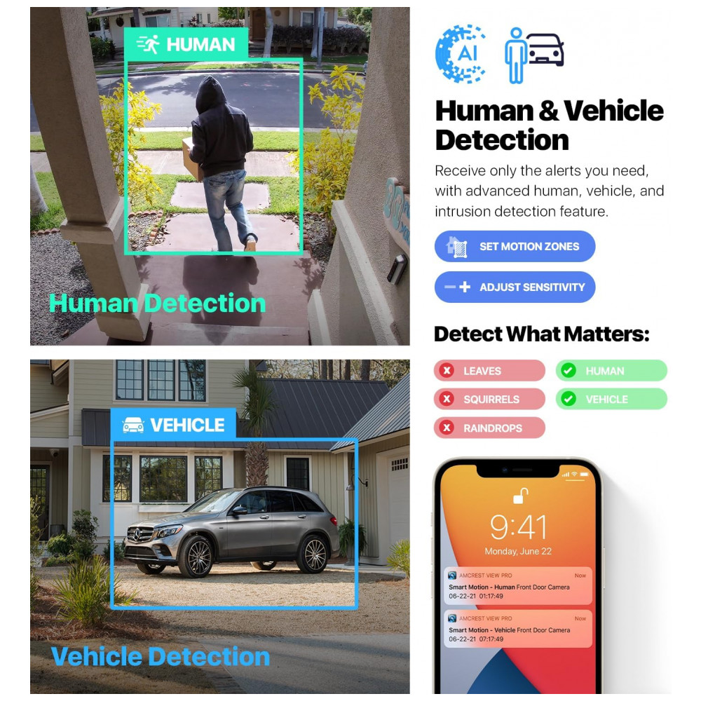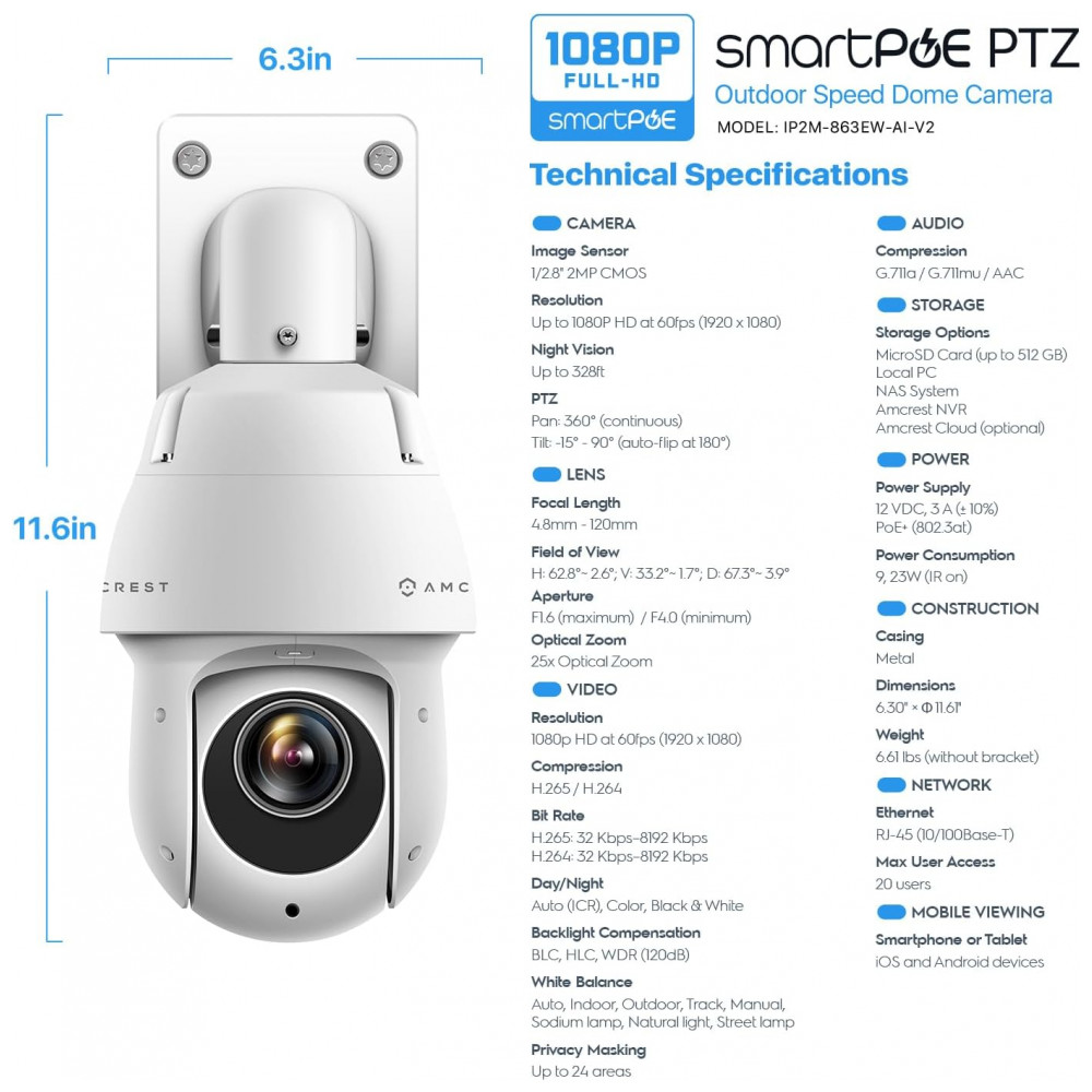 Mais inteligente, mais , mais Utilize alertas inteligentes que enviam notificações para o seu computador ou smartphone por meio do aplicativo Amcrest View. Grave eventos nesta câmera PTZ POE assim que eles acontecerem e zene os em seu computador, MicroSD até 256GB, NAS ou Amcrest Cloud. Esta câmera requer alimentação PoE 802.3at para funcionar. Utilize o recurso de zoom de inclinação panorâmica com zoom óptico motorizado de 25x e zoom digital de 16x, bem como panorâmica contínua de 360 e inclinação de 90, capturando todos os ângulos.