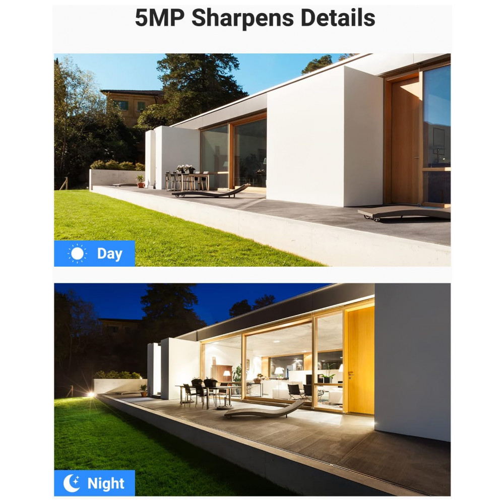 Super HD de 5 MP com ângulo de visão ultra amplo Com sensor exclusivo OmniVision, esta câmera de segurança IP de 5 MP filma tudo por meio de uma lente grande angular de 2,. Aprimorado por 120 dB true WDR 3D DNR, onde quer que você esteja preocupado é mais nítido e tem menos pontos cegos do que antes