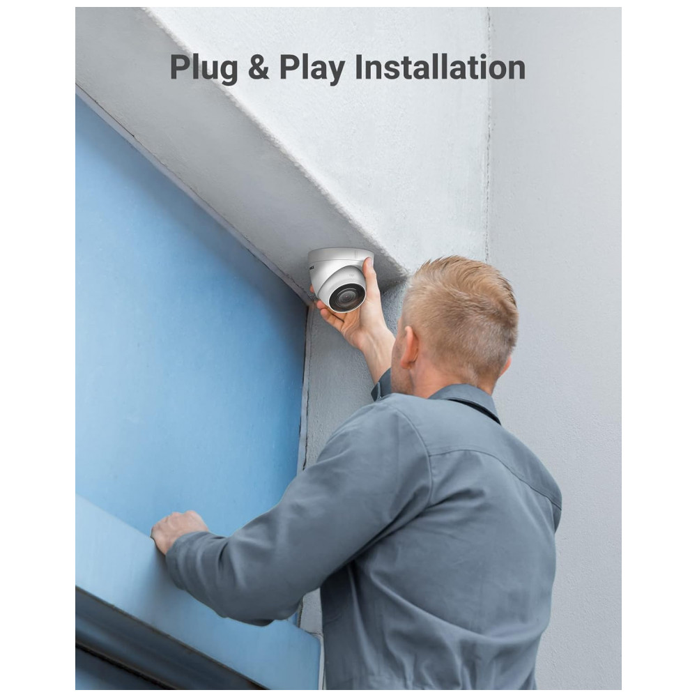 Configuração Plug Play PoE Esta câmera de segurança PoE de 5mp precisa de apenas UM cabo ethernet para conectar com o NVR para dados e transmissão de energia. Fonte de alimentação não incluída. Graças à sua fácil instalação, você pode colocá lo em uma garagem, porta de entrada, loja, etc., como quiser. Conectar e proteger é muito fácil