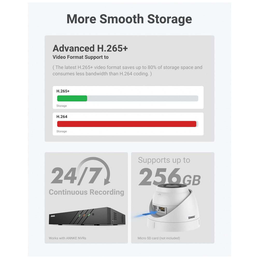 Suporte para cartão de memória, zenamento NVR Esta câmera ip de torre grava 24 horas por dia, 7 dias por semana ou vídeos acionados por movimento através de um cartão microSD até 256 GB, não incluído ou NVR. ANNKE NVR funciona melhor com esta câmera externa, pois sua codificação exclusiva de H.265 permite uma gravação mais longa e menor consumo de largura de banda sem perder a qualidade de 5MP