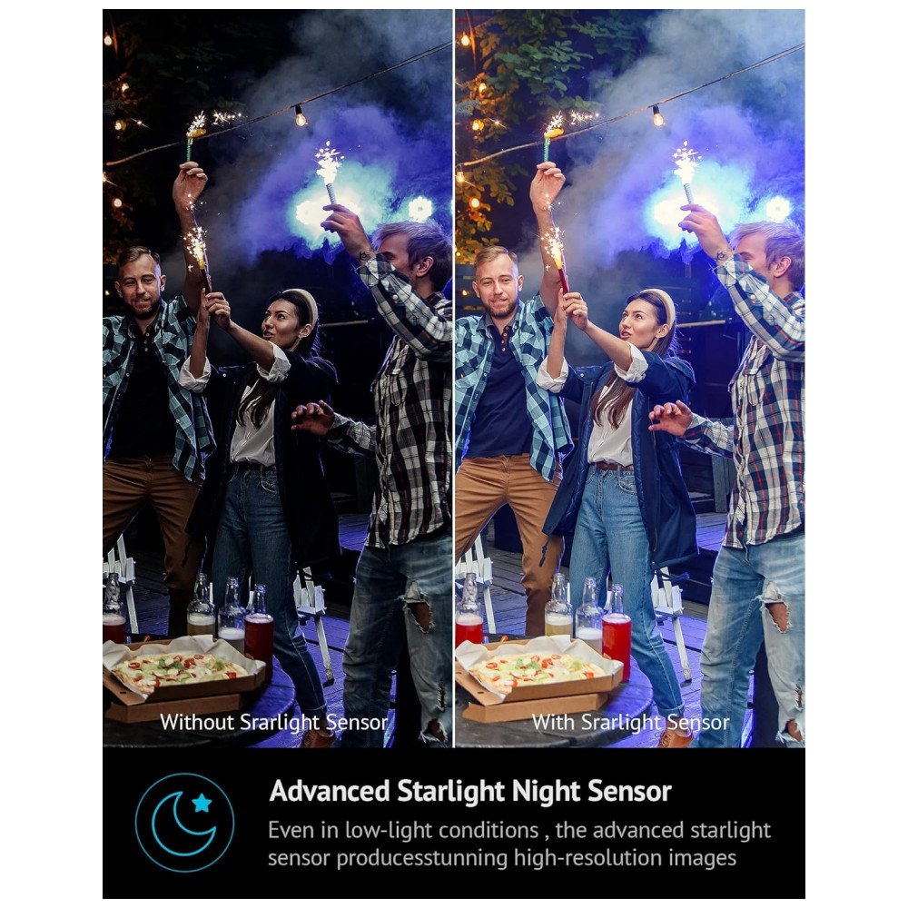 Câmera de segurança de gravação ao ar livre traz a visão ultra clara e o momento detalhado em tempo real, gravações ou imagens ao vivo o tempo todo. O poderoso sensor de luz estelar integrado que pode fornecer uma visão noturna colorida, 40 vezes mais escura que as câmeras de vídeo tradicionais e a nova abertura F, 1.4 captura 2,5 vezes mais luz, permitindo uma visão de alta qualidade mesmo à noite