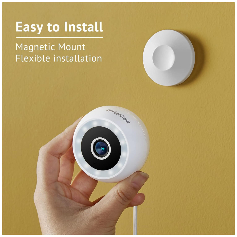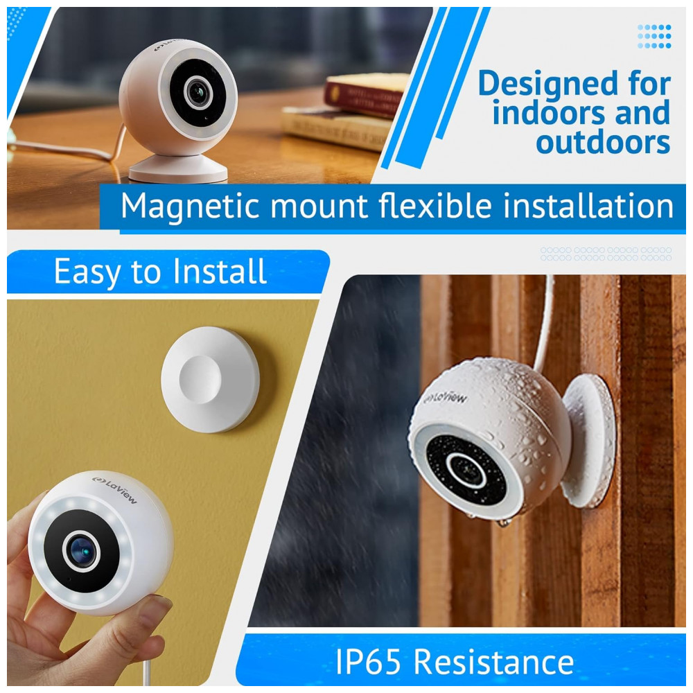 Interno e externo Câmera de segurança doméstica Laview Câmera de vídeo 2K com fio com áudio bidirecional de resistência IP 65. A câmera de vigilância e segurança é ótima tanto para ambientes externos quanto internos. Você pode instalar a câmera fora de casa ou no quarto das crianças. O suporte magnético permite que você instale facilmente a câmera de segurança em qualquer lugar da sua casa. Este método de instalação flexível ajuda você a ajustar facilmente o ângulo de visão da câmera