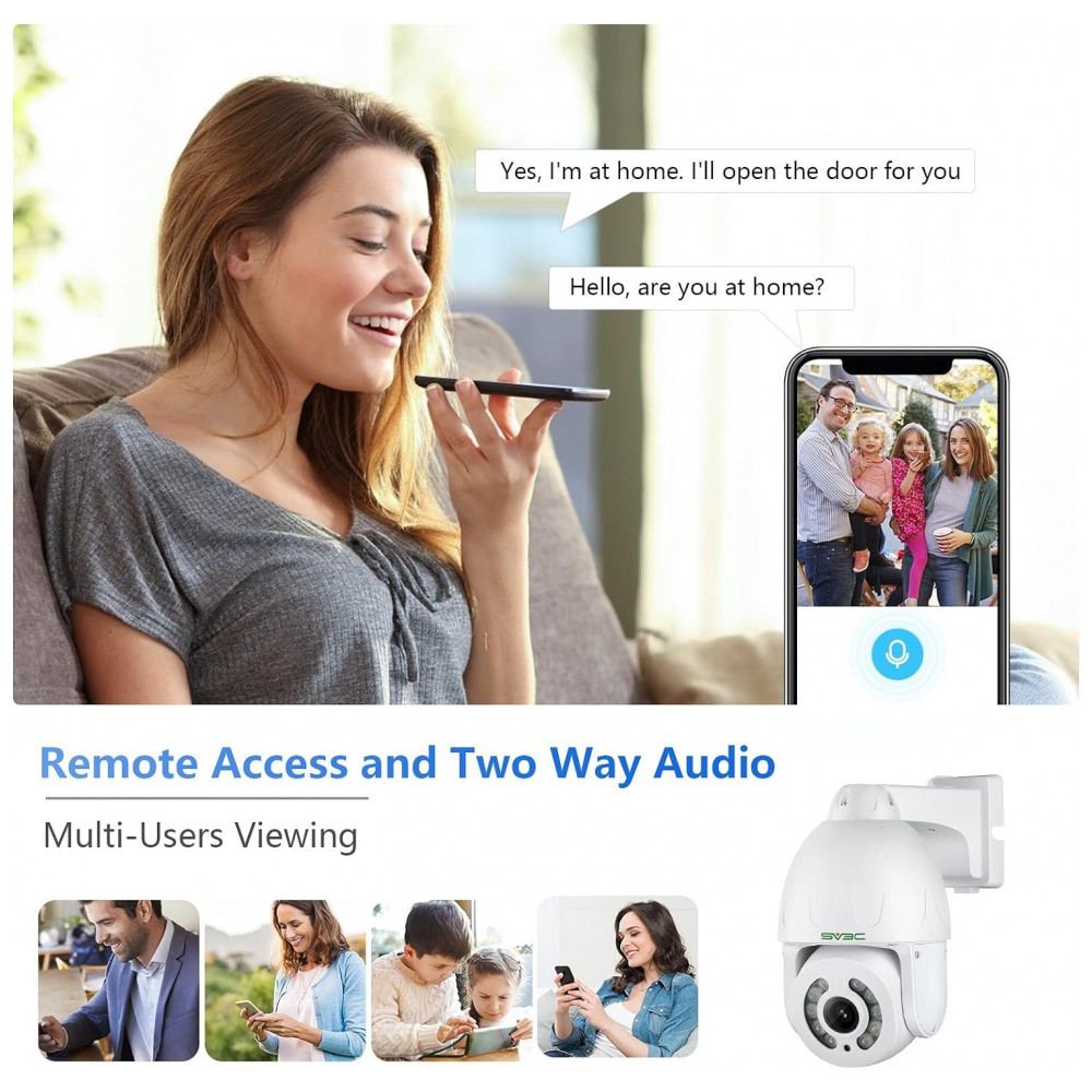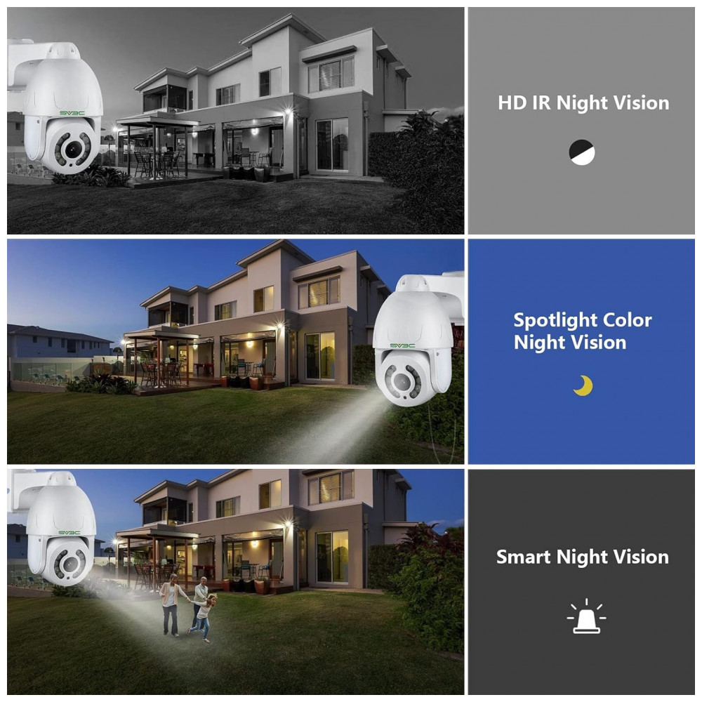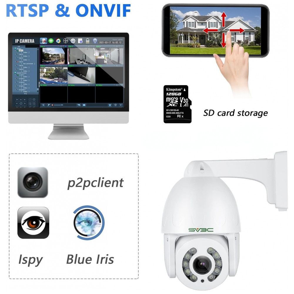 Compatível com o Mutli Software os aplicativos de fornecimento SV3C que a câmera ptz poe ip trabalha com telefone Camhipro, Andriod , ios , computador HIP2P Cliente, Windows , MAC , controle remoto configure a câmera de rastreamento de movimento e faça o download de gravações de vídeo sem nenhum custo. A câmera de segurança 5MP Poe suporta navegador, RTSP, trabalha com Blue Iris, NVR, FTP Server, Mailbox. A câmera poe externa PTZ possui suporte para slot para cartão SD no máximo 128gb para cartão SD. Defina gravações 24, 7, agendadas ou ativadas por movimento, todas podem ser suportadas