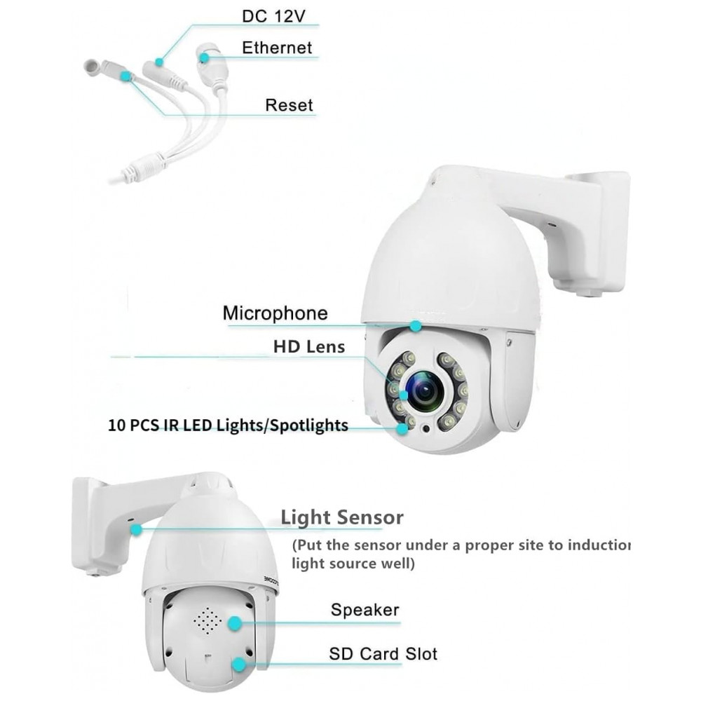 Instalar a câmera ptz ip de 5mp com POE é rápida, fácil, reta e estável. PoE com um injetor ou interruptor PoE via Ethernet Cat5 ou Cat6, a câmera de segurança PTZ pode ser conectada à Internet, alimentada por todo o cabo de rede . No caso de nenhum dispositivo de fonte de alimentação poe, o pacote SV3C vem com um adaptador de energia separado cabo de 3m para alimentar a câmera poe. Usando a codificação h.265, reduza substancialmente a taxa de bits acima de h.264, economize espaço e a transmissão de vídeo é mais suave