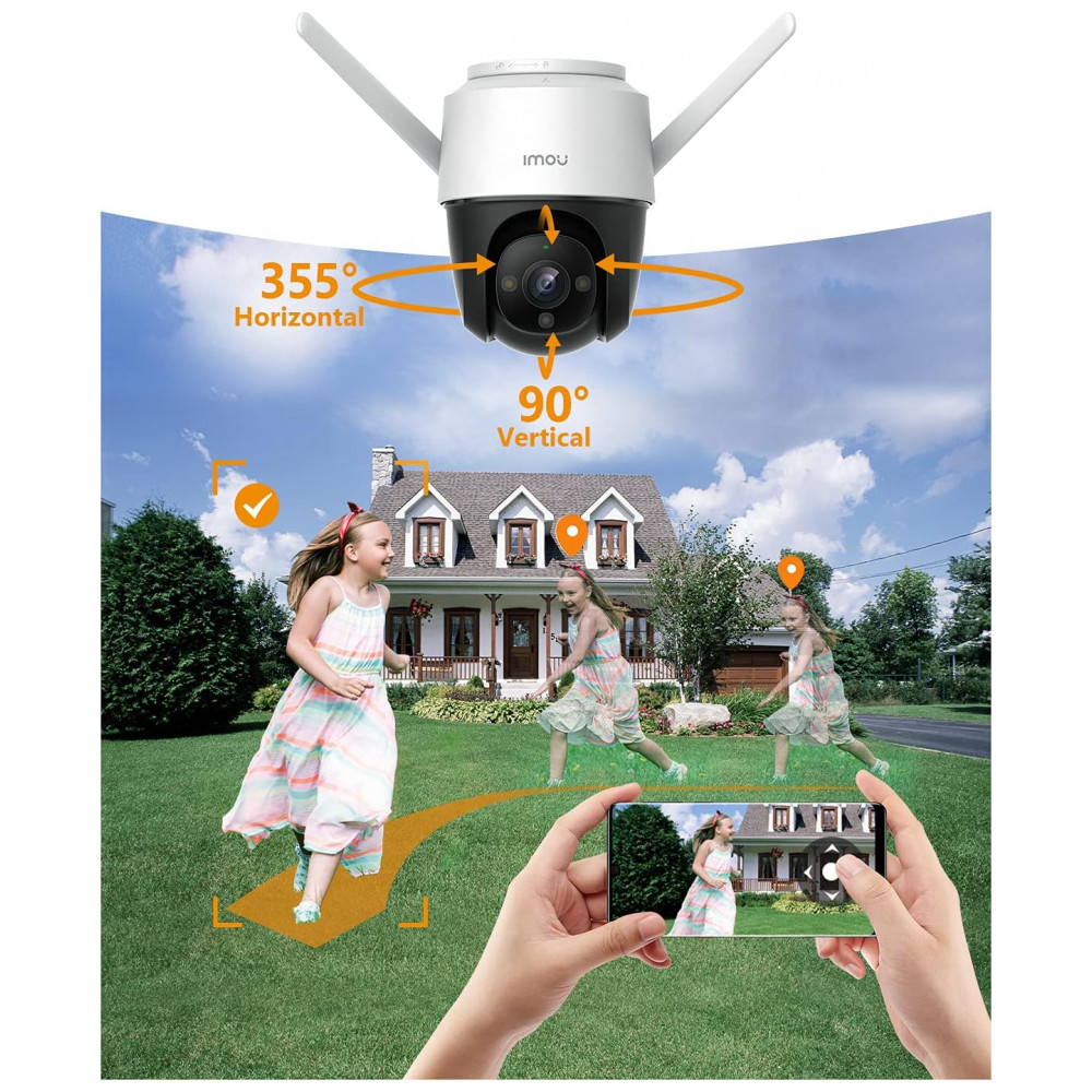 COBERTURA 360 24, 7 COR COMPLETA A ótica de vidro QHD de 4MP e 2 focos embutidos fornecem imagens nítidas e coloridas dia e noite. A faixa de rotação horizontal e vertical de 355 cria uma cobertura completa. 1 câmera instalada e 0 detalhe serão perdidos