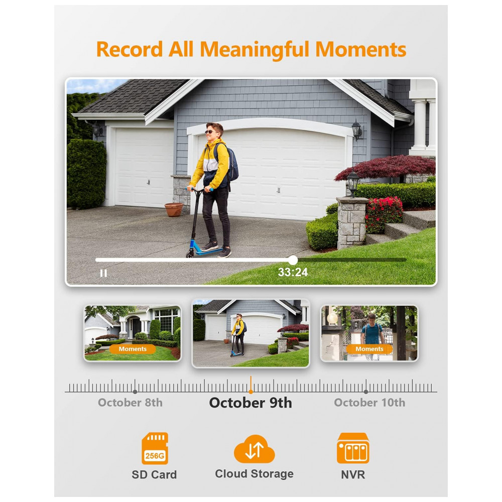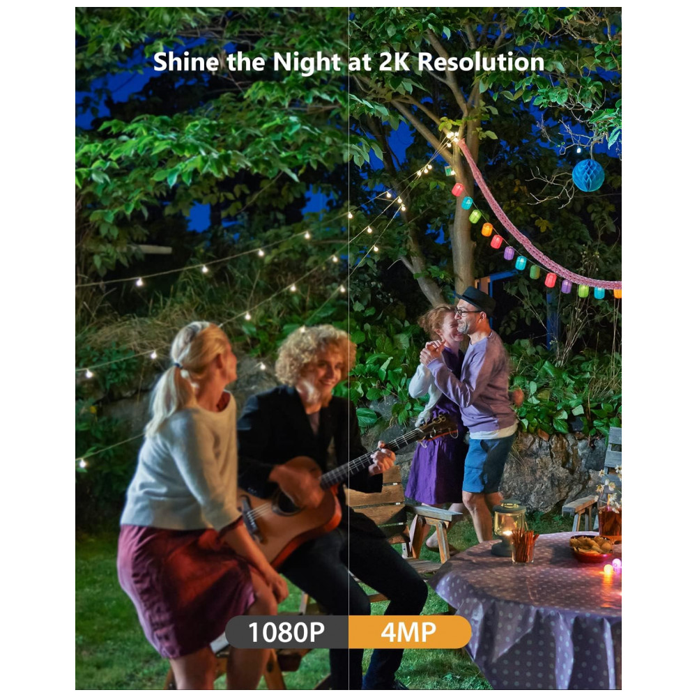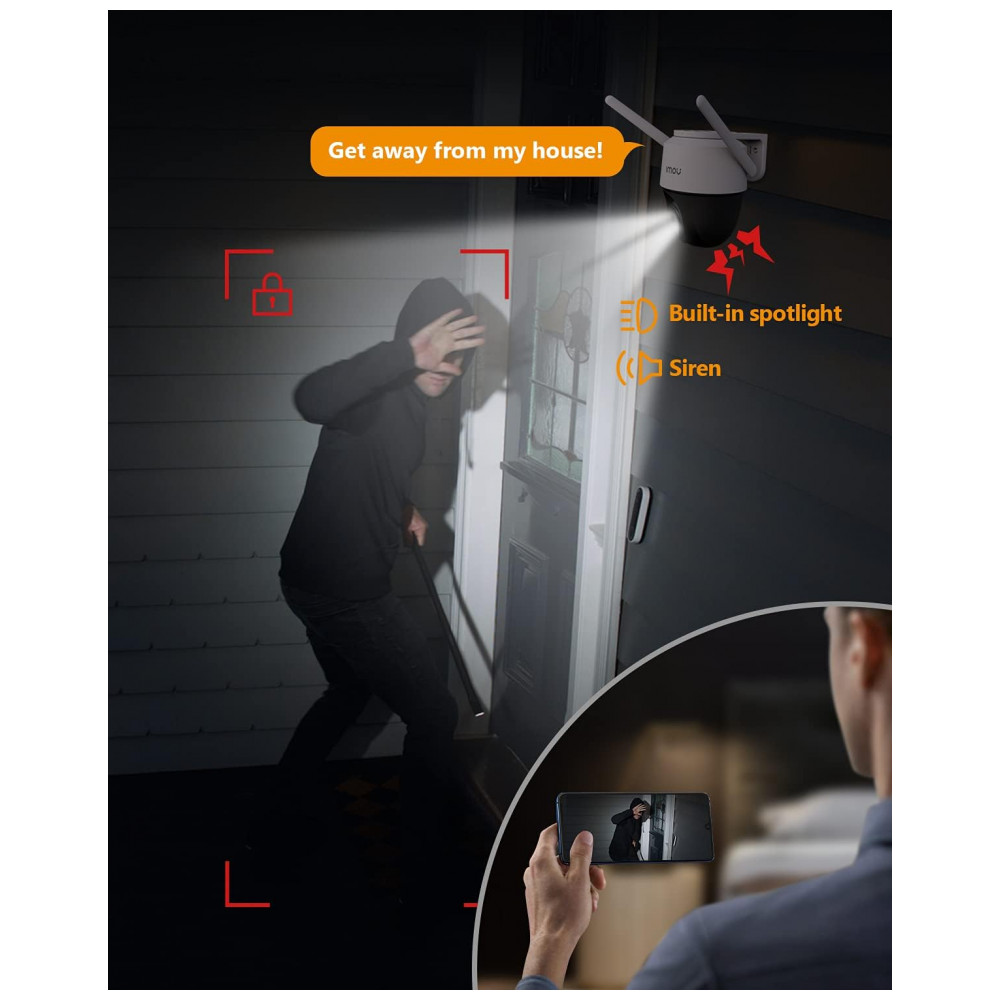 ALARME DE SANGUE E SOM Esta câmera externa será ativada no momento em que o movimento humano for detectado. Em seguida, liga automaticamente a mini luz de inundação, al a sirene de segurança, grava a cena e envia alertas para o seu smartphone. Abafar qualquer crime no berço