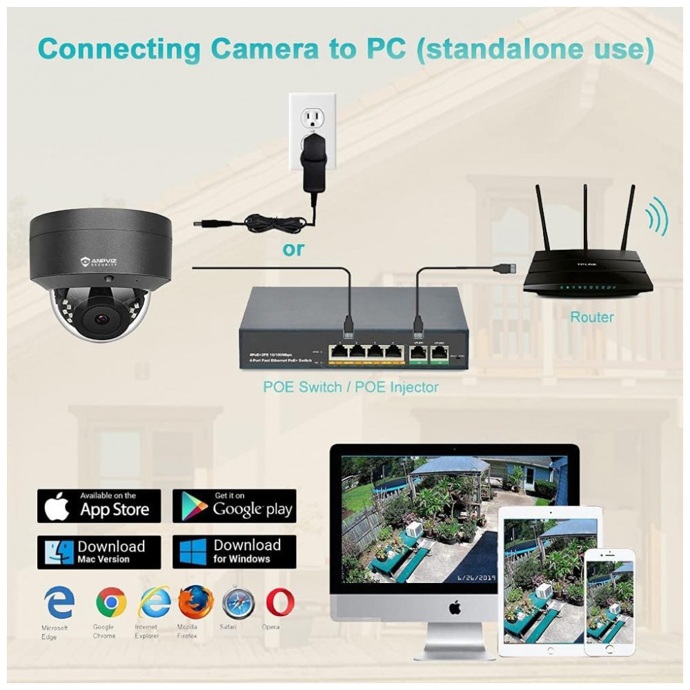 Câmera PoE externa e interna Esta câmera de segurança POE ip precisa apenas de um cabo Ethernet para transmitir sinais de vídeo e obter fonte de alimentação simultaneamente. PoE com apenas um cabo Ethernet até 300 pés , nenhum adaptador de energia é necessário, interruptor ou injetor PoE opcional, configuração fácil com plug and play. Esta câmera dome é adequada para áreas residenciais internas e externas, loja de varejo, negócios.