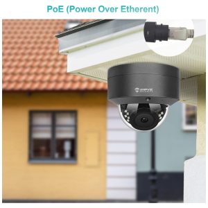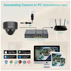 Câmera PoE externa e interna Esta câmera de segurança POE ip precisa apenas de um cabo Ethernet para transmitir sinais de vídeo e obter fonte de alimentação simultaneamente. PoE com apenas um cabo Ethernet até 300 pés , nenhum adaptador de energia é necessário, interruptor ou injetor PoE opcional, configuração fácil com plug and play. Esta câmera dome é adequada para áreas residenciais internas e externas, loja de varejo, negócios.