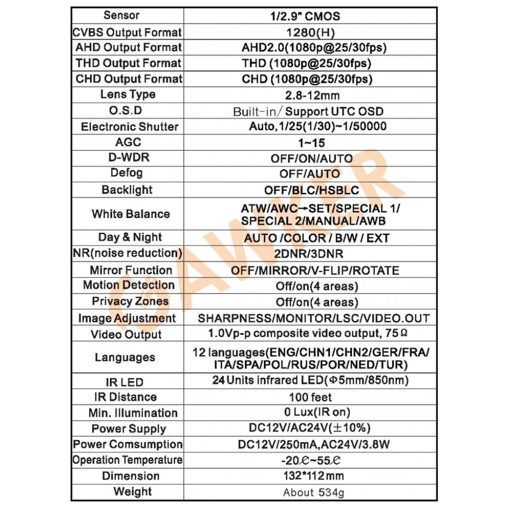 HD TVI AHD CVI e CVBS 4 em 1, saída de vídeo padrão CVBS.