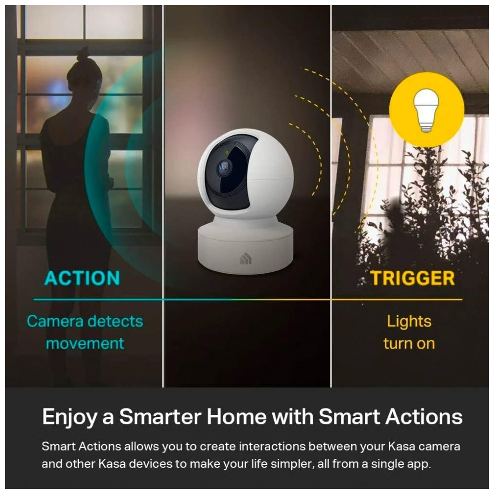 Ações inteligentes como uma das câmeras de segurança mais fáceis de usar, a EC70 oferece uma maneira de configurar suas luzes para acender quando sua câmera detecta movimento com ações inteligentes, que permitem criar interações entre sua câmera e outros dispositivos Kasa