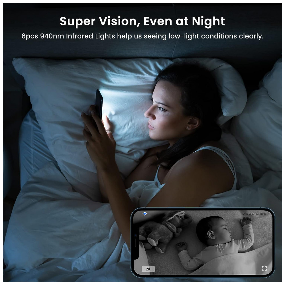 Os LEDs infravermelhos de 6pcs 940nm garantem uma visão noturna de até 33 pés, você pode verificar seu bebê , animal de estimação na página clara de alimentação ao vivo, mesmo na escuridão. Três modos noturnos são opcionais para a escolha.