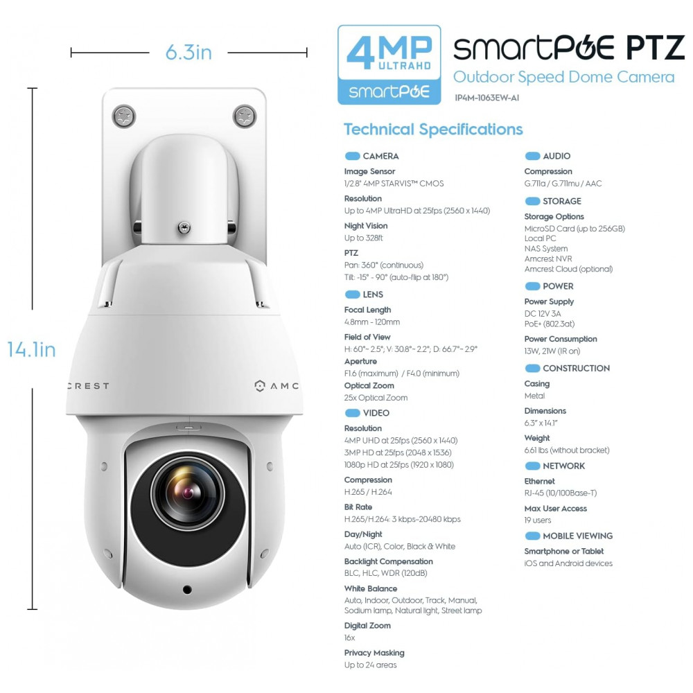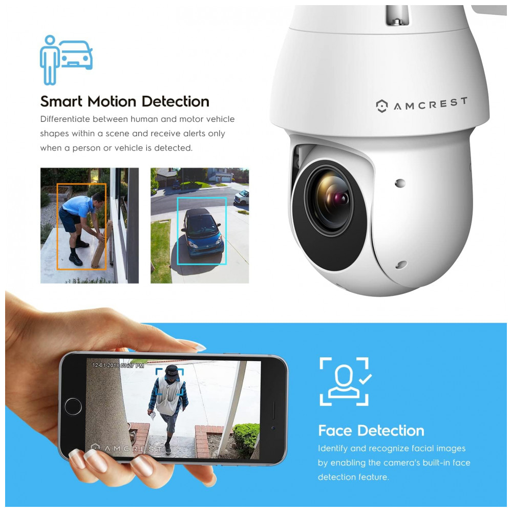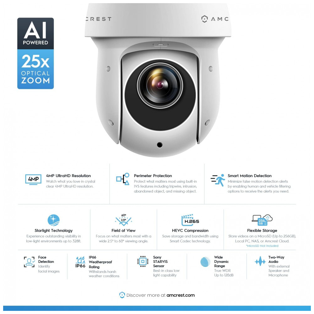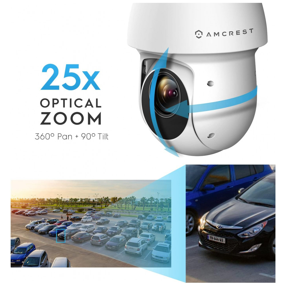 Mais inteligente, mais e segura Utilize alertas inteligentes que enviam notificações para o seu computador ou smartphone através do aplicativo Amcrest View. Grave eventos nesta câmera PTZ POE assim que eles acontecerem e zene os no seu computador, MicroSD até 256GB , NAS ou Amcrest Cloud. Esta câmera requer PoE energia 802. 3at para operar. Utilize o recurso de zoom de inclinação da panorâmica com zoom motorizado óptico de 25x e zoom digital de 16x, bem como panorâmica contínua de 360 , inclinação de 90 capturando todos os ângulos.