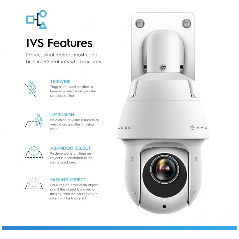 CARACTERÍSTICAS A câmera IP PTZ Speed Dome PoE AI possui Detecção de rosto, IVS profundo Tripwire, Intrusão, Objeto abandonado, Objeto ausente , Relatório de metadados de vídeo Pessoas, Veículo não motorizado, e Veículo a motor e Detecção de movimento inteligente. Observe que os recursos de IA incluídos na câmera são incorporados e não exigem um NVR de IA para funcionar. Um injetor ou interruptor de PoE é necessário Não incluído Usa PoE 802.3at . Oferece vídeo 4MP 25fps com um amplo ângulo de visualização de 60 .