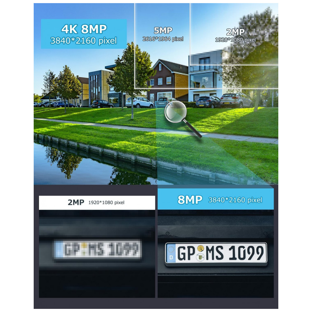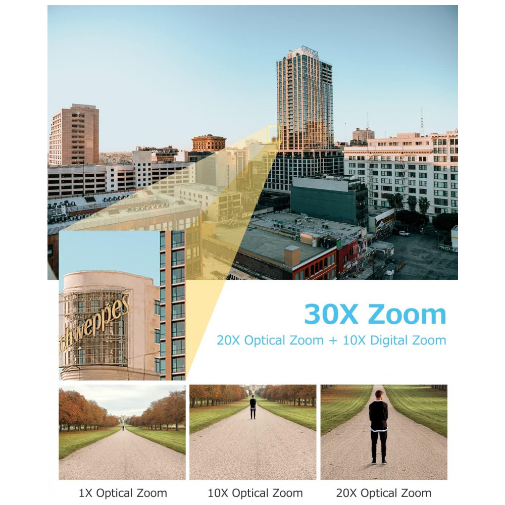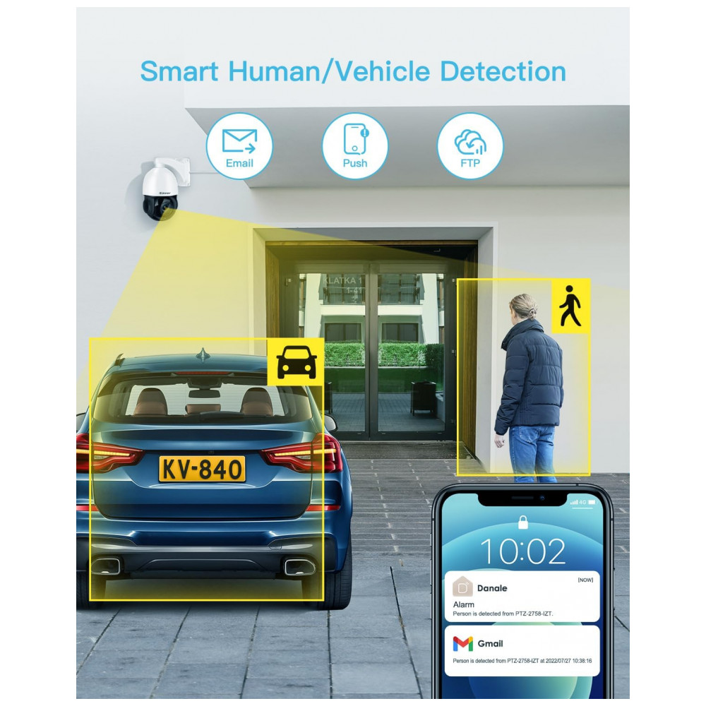 Ultra 4K HD e zoom óptico de 20XEsta câmera externa de 8MP PTZ apresenta clareza ultra alta de 4K Ultra HD, que é 1,6 vezes mais nítida do que as câmeras de 5MP. Com lente motorizada de 4,784,, permite zoom óptico de 20X e zoom digital de 10X sem prejudicar a qualidade da imagem. Suporta a visualização remota da placa do carro, ótimo para uso em locais amplos como estacionamentos, hipers, jardins, beiras de estradas, etc.