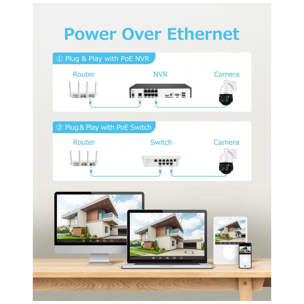 Power Over Ethernet e atualização de alta codificaçãoA câmera de segurança IP POE de 8MP possui uma função POE. Apenas um cabo Ethernet é necessário para alimentação e conexão de dados. Poe é, sem dúvida, uma conexão mais estável. A tecnologia de codificação eficiente atualizada economiza recursos de largura de banda e espaço de zenamento. Ele não apenas transmite vídeos mais claros e suaves, mas também economiza 70 do espaço de zenamento em disco. Melhor algoritmo de codificação para economizar mais largura de banda e zenamento