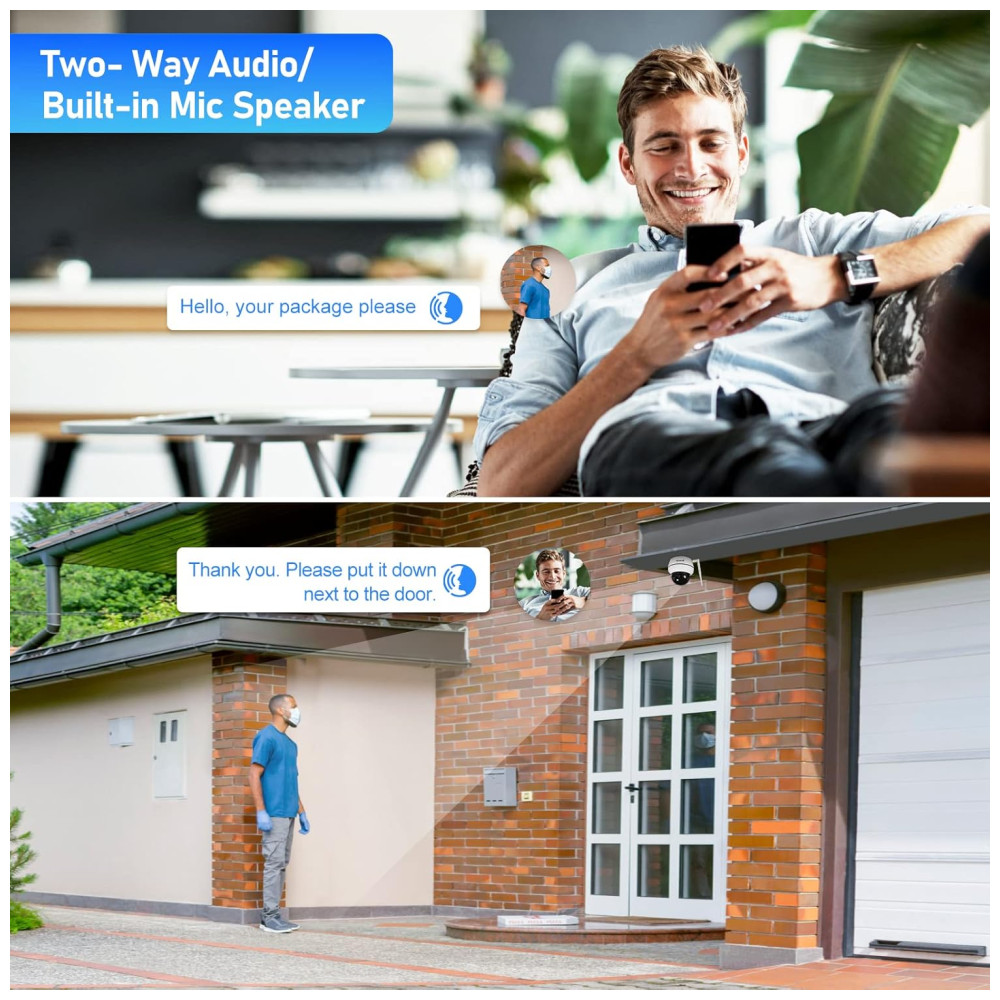 Áudio bidirecional e visualização remota permite que você se comunique com as pessoas na área de vigilância quando estiver longe de casa. Ao receber um alerta, você pode dar um aviso para se livrar do perigo. Dê as boas vindas aos seus amigos, avise os visitantes indesejados. Observação ligue o alto falante e o microfone do dispositivo e alterne o ícone de áudio. O áudio da configuração padrão da câmera está desativado.