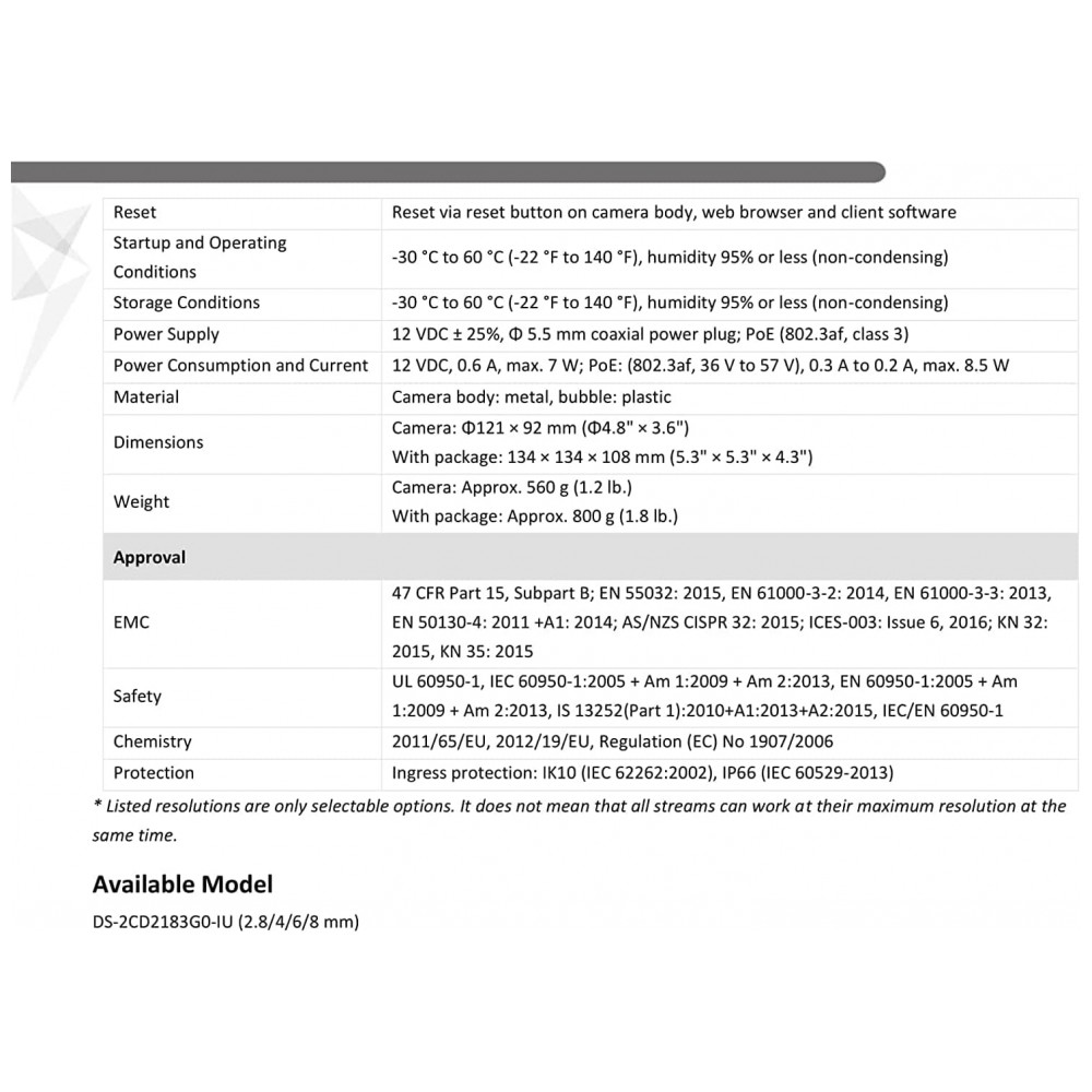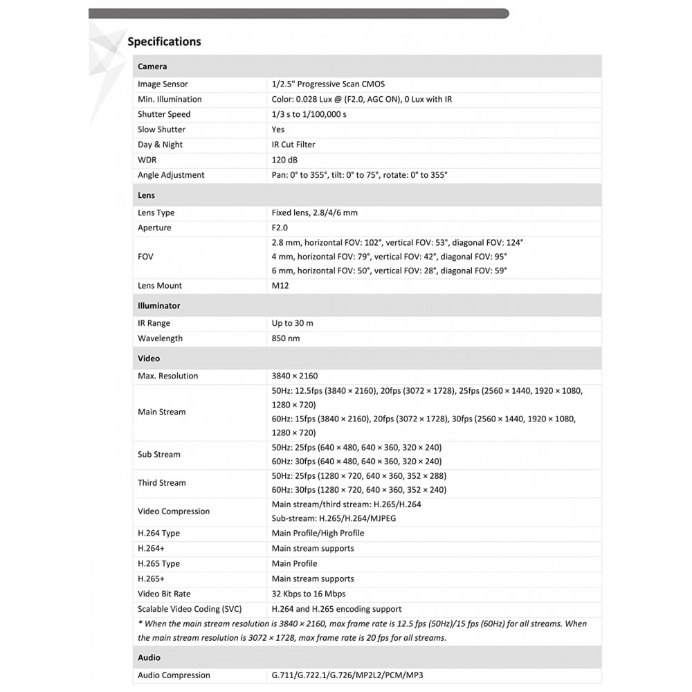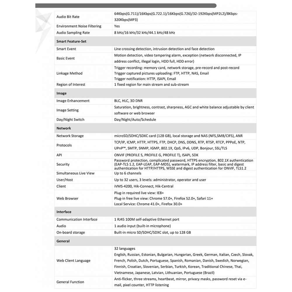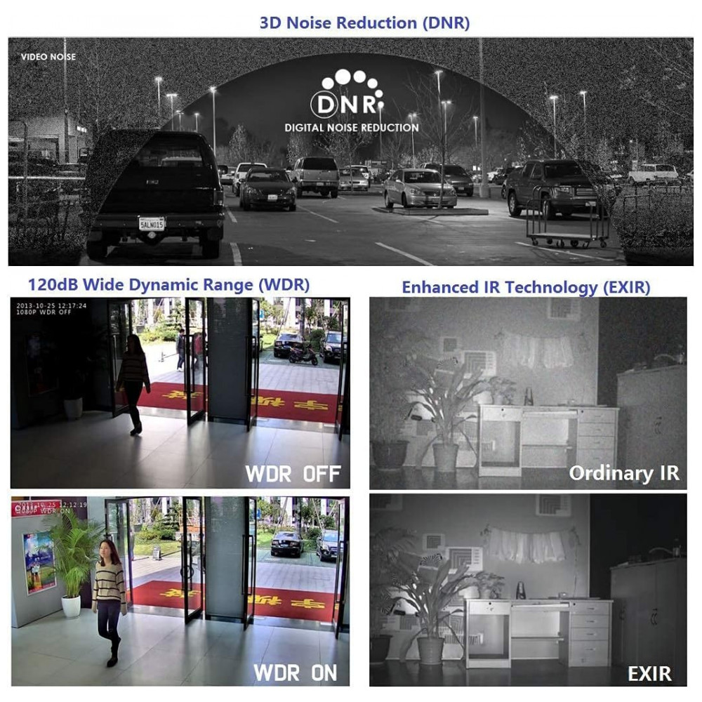 QUALIDADE Microfone integrado, redução de ruído digital 3D, ampla faixa dinâmica digital, faixa de infravermelho de até 45m, compressão de vídeo H.265, H.265, H.264, H.264.