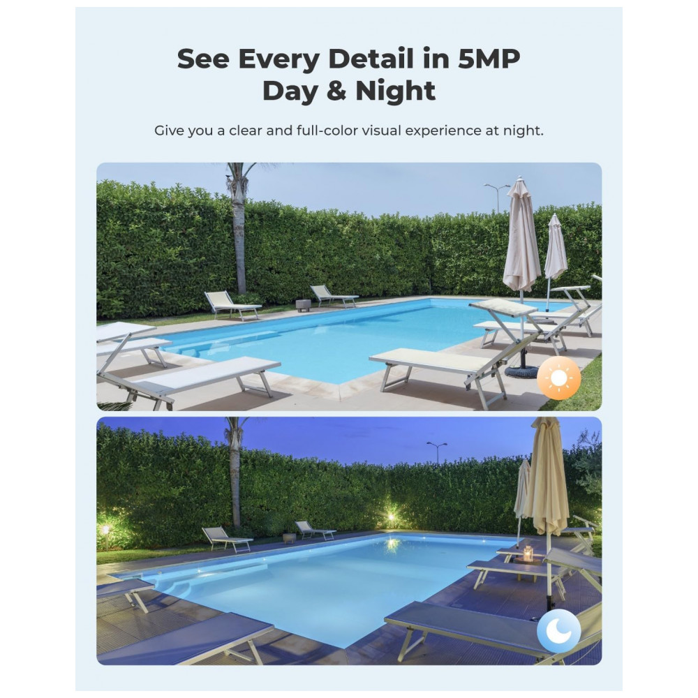 2K SUPER HD E VISUALIZAÇÃO COMPLETA Com alta resolução de 2560 x 1440, esta câmera de segurança captura vídeos mais nítidos e claros do que as câmeras 1080p. Com panorâmica de 355 e inclinação de 140, oferece um ângulo de visão ultra amplo e cobre mais áreas para garantir a segurança da sua casa.