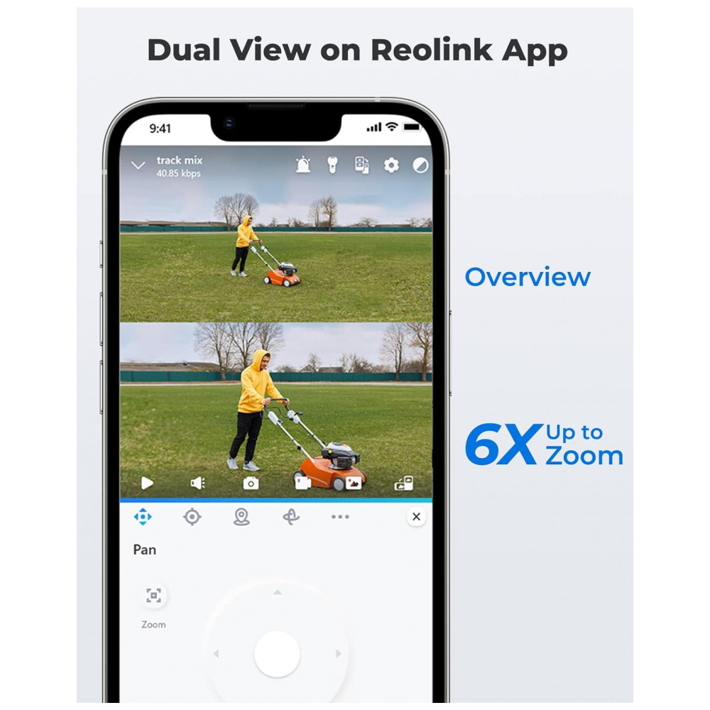 Rastreamento automático e zoom 6X A lente telefoto e a lente PT de grande angular permitem o rastreamento automático e o zoom híbrido 6X para acompanhar de perto e focar no alvo. Você pode ter uma visão geral ultralarga e um close up nítido ao mesmo tempo na exibição dupla