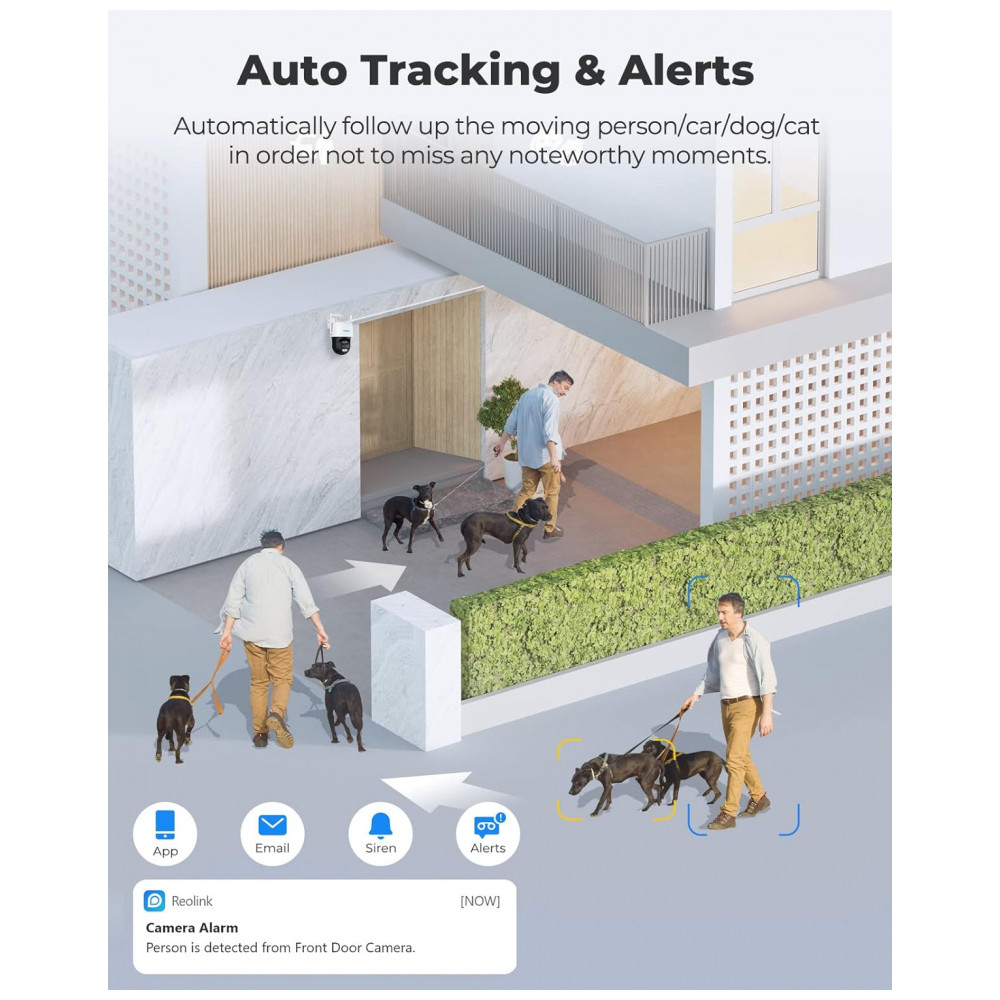 Alertas de pessoas, veículos e detecção de animais de estimação detecta de forma inteligente o movimento de pessoas e veículos e envia alertas precisos em tempo real. O recurso, detecção de animais de estimação, também permite que você fique de olho em cães e gatos. Descanse sua paz de espírito em qualquer lugar a qualquer hora.