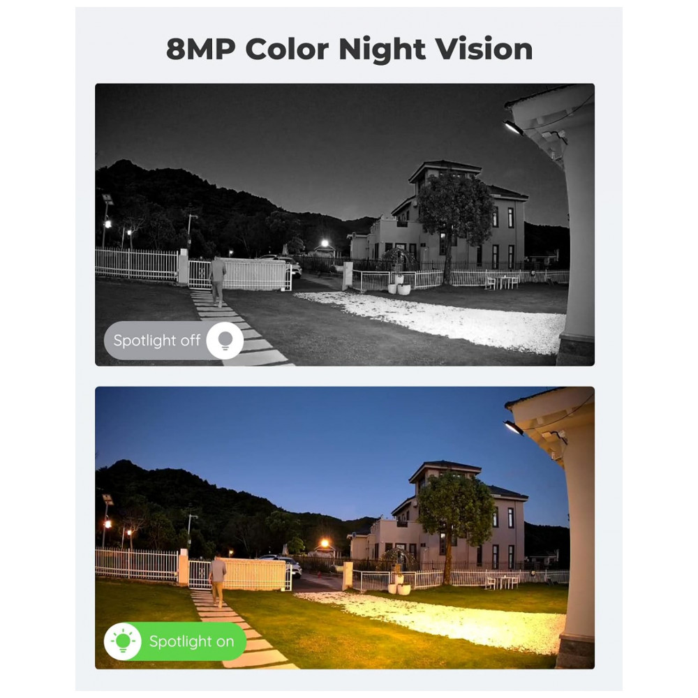 Dia e noite em cores de 8 MP a lente grande angular de 8 MP pode oferecer uma visão geral nítida de 4K UHD em cores. Os holofotes embutidos permitem imagens coloridas brilhantes e claras, mesmo na noite escura