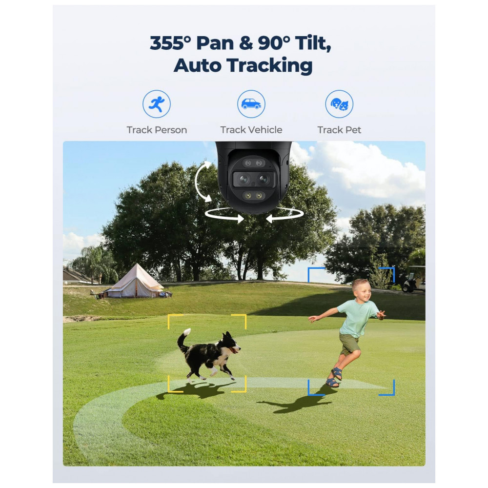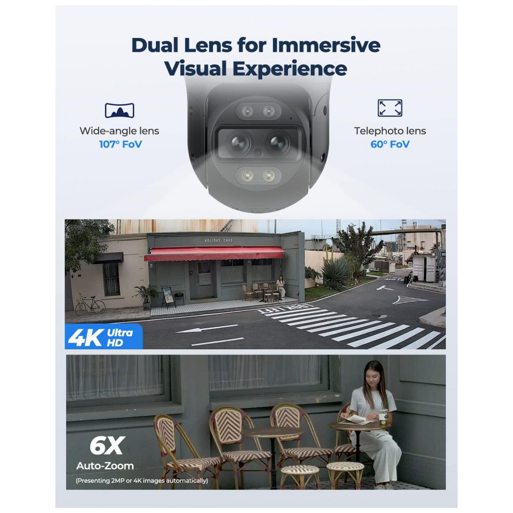 RASTREAMENTO AUTOMÁTICO E ZOOM HÍBRIDO 6X A lente grande angular PT rastreia o alvo enquanto a teleobjetiva aumenta o zoom para focar os detalhes. A visualização em close oferece visualizações de 2MP ou 4K automaticamente. Você pode escolher três modos de rastreamento diferentes para melhor atender às suas necessidades.