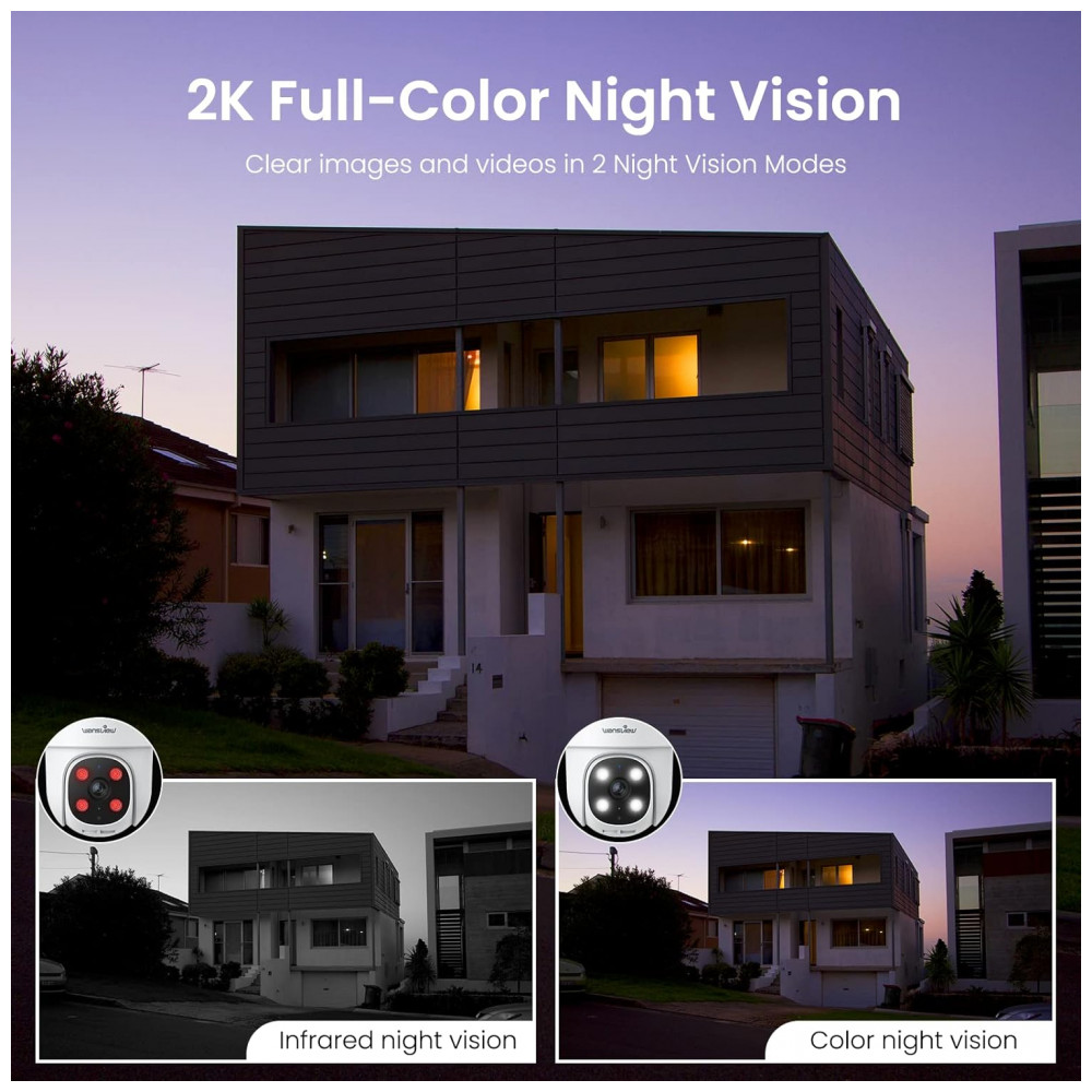Câmera externa 2K com visão noturna colorida Em comparação com câmeras 1080P, esta câmera externa à prova dágua possui pixels 2K 3MP que mostram imagens de alta qualidade. Com a luz branca integrada, esta câmera de segurança externa pode exibir imagens nítidas mesmo em ambientes extremamente escuros. Quando a luz é acesa à noite, mostra a cor da visão noturna. Assim, você pode ver claramente se há objetos suspeitos no pátio e ver tudo o que aconteceu no âmbito do monitoramento.