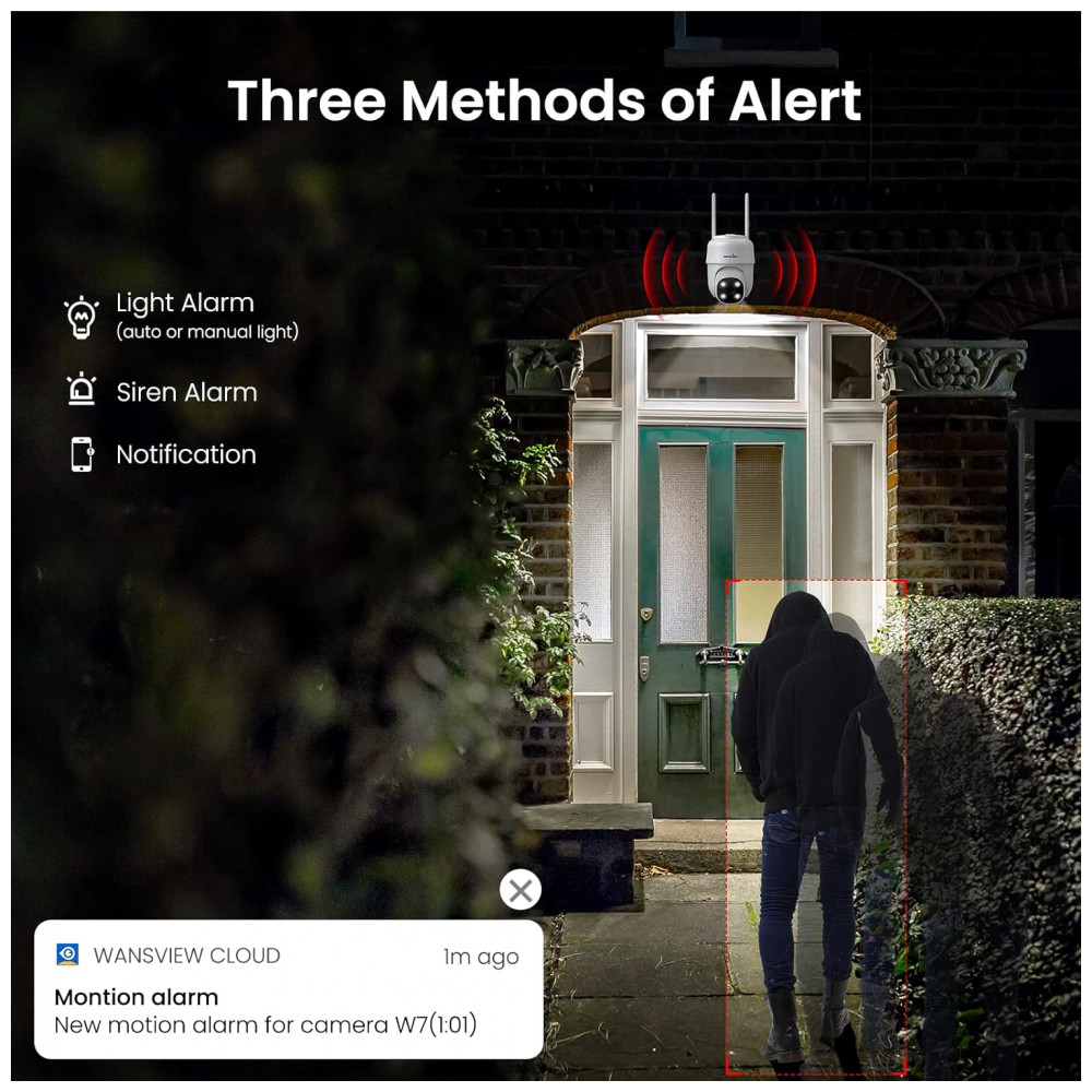 Detecção de movimento aciona alertas em tempo real Esta câmera externa de segurança possui um sensor embutido. Ao ativar o alerta de movimento no aplicativo Wansview Cloud, a câmera começará a gravar automaticamente assim que o movimento for detectado. E o aplicativo de nuvem Wansview enviará alertas push em tempo real sobre o movimento, o que garante a segurança da sua casa a tempo.