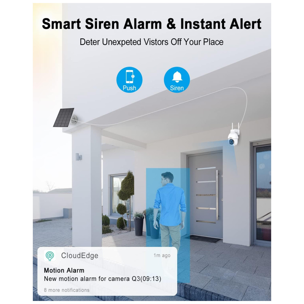 Alarme de sirene inteligente e holofotes O trabalho exclusivo do Smart Siren Alarm com o Spotlights é realmente um design incrível quando a câmera externa Anran detecta visitantes inesperados à noite no escuro e os derruba do seu lugar imediatamente.