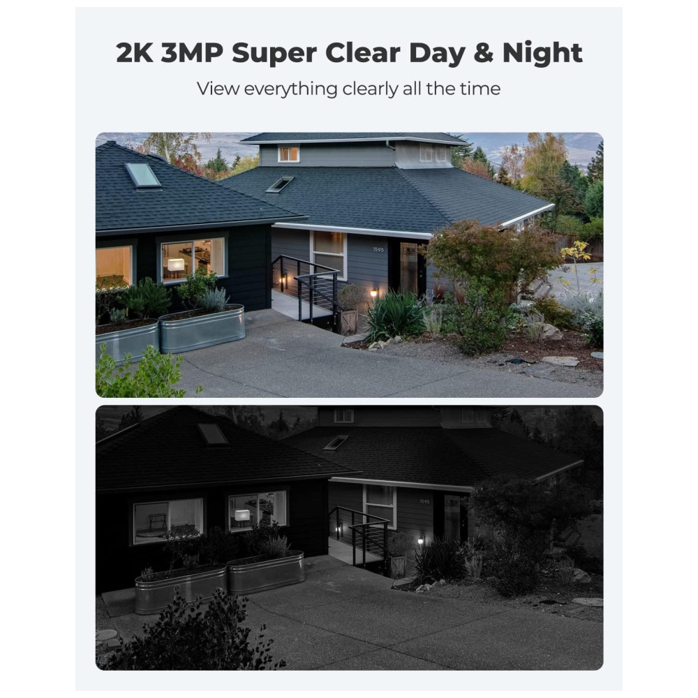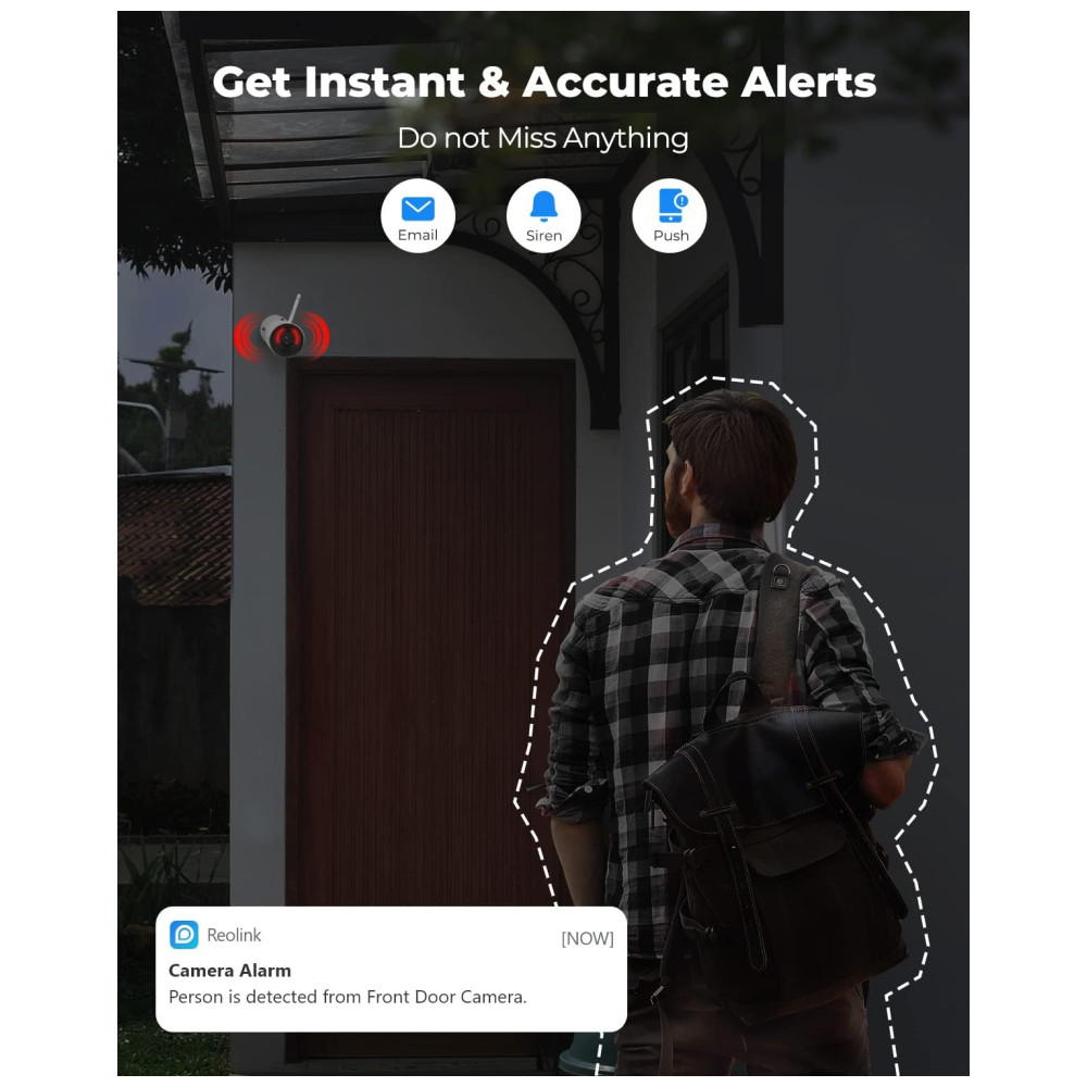 Detecção de movimento PIR inteligente e alertas instantâneos O sensor de movimento PIR digital é mais sensível e quase não envia alarmes falsos. Você receberá notificações instantâneas de aplicativos, alertas de e mail e alarmes sonoros sirene quando eventos de movimento forem detectados. Configure com flexibilidade a sensibilidade ao movimento e o tempo de trabalho para evitar alarmes falsos cas por mariposas esvoaçantes ou galhos voando.