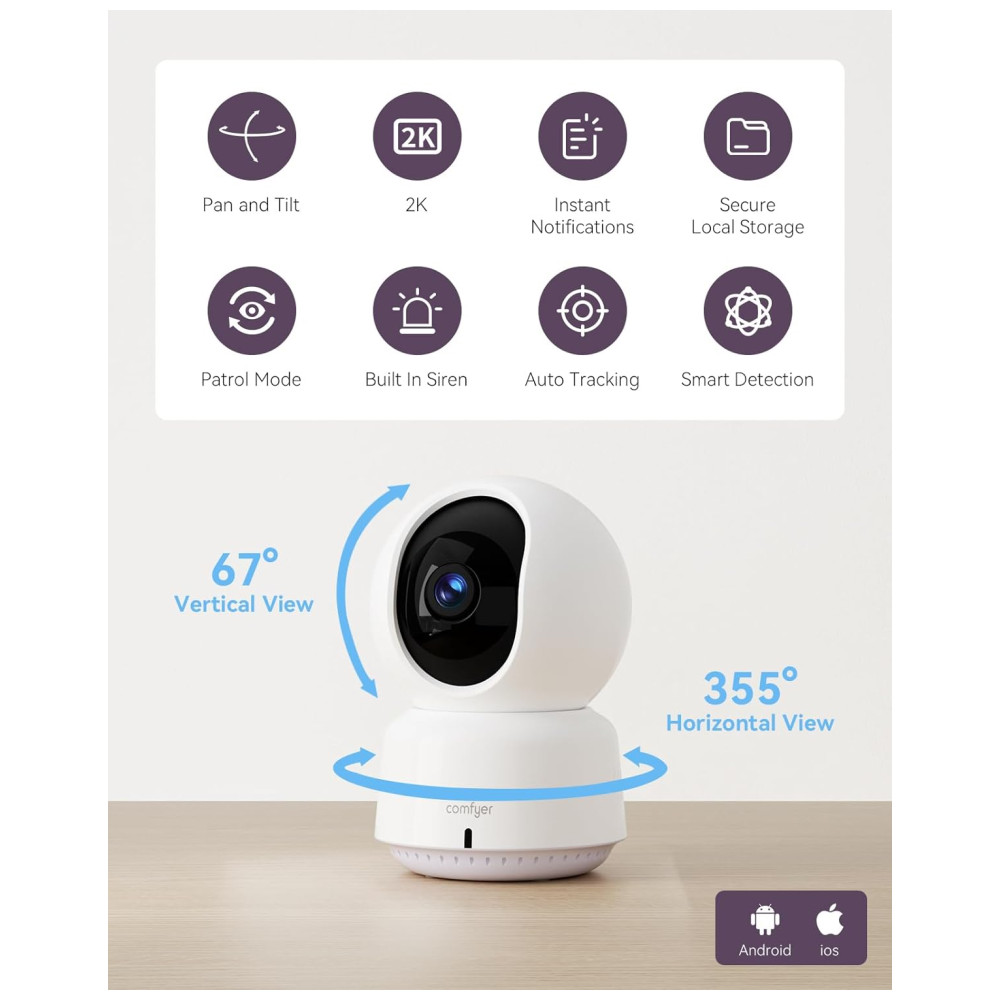 Câmera de Vigilância BabyPet para Ambientes Internos Resolução 2K QHD Controle via App Rastreamento Automático Detecção de Movimento Comfyer