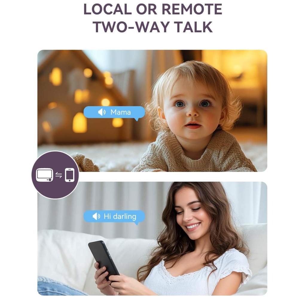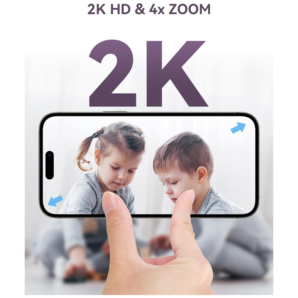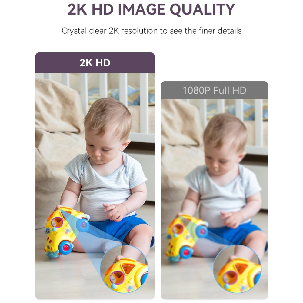 Desfrute de uma resolução 2K HD com zoom 4X para imagens de alta qualidade com lente grande angular de 3,6 mm e sensor CMOS de alta qualidade. Mesmo em condições de pouca luz ou à noite, este monitor captura detalhes incríveis, permitindo observar movimentos sutis, como a respiração do seu bebê. Com detecção avançada de movimento e som, você receberá alertas no seu smartphone para qualquer ruído ou movimento suspeito. Com instalação simples e proteção total da privacidade, esta câmera inteligente oferece rotação de 360 graus, rastreamento automático aprimorado, funções inteligentes, monitoramento de temperatura, visão noturna, entre outras. Compatível com até 4 câmeras, tela dividida, área de alerta personalizada, aviso de alimentação, gravação de vídeo, compartilhamento com várias pessoas e áudio bidirecional. Não precisa de pilhas, garantindo que você nunca fique sem energia.