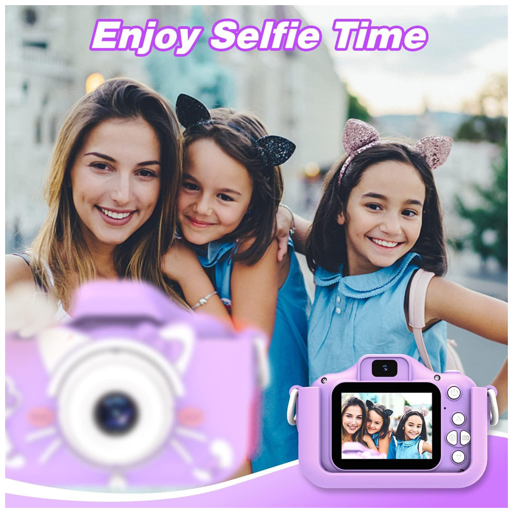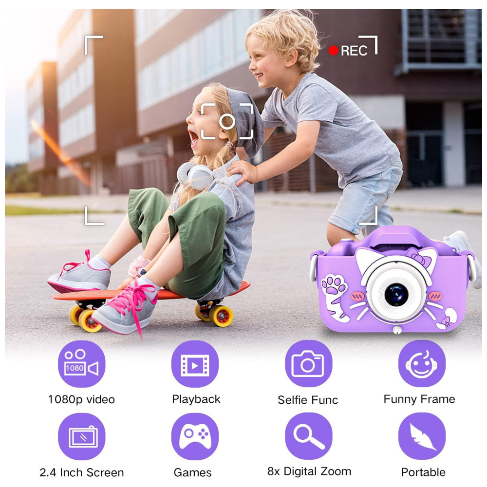 Câmera infantil Goopow para crianças de 3 a 8 anos com vídeo HD 1080p 12MP zoom digital 8x 28 molduras divertidas e cartão SD de 32GB incluso.