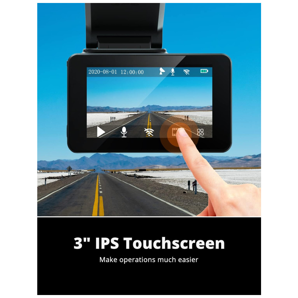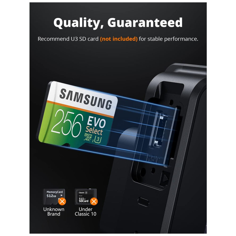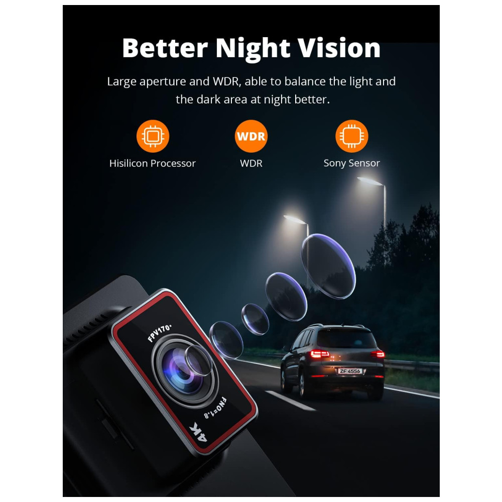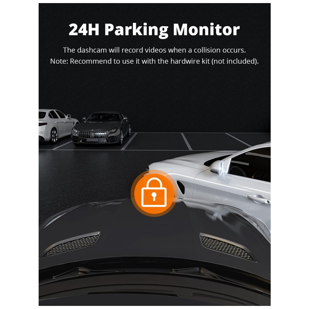 Suporta cartão TF de até 256GB não incluído, o que é suficiente para gravar vídeos 4K. Combinado com a função de gravação em loop para que você nunca perca nenhuma evidência crucial. Isso significa proteção 24 horas para o seu carro. Para atender plenamente a gravação e reprodução de vídeo de resolução 4K, use cartão micro SD de alta resistência pelo menos nível U3. Recomendamos cartão micro SD SAMSUNG 256GB U3