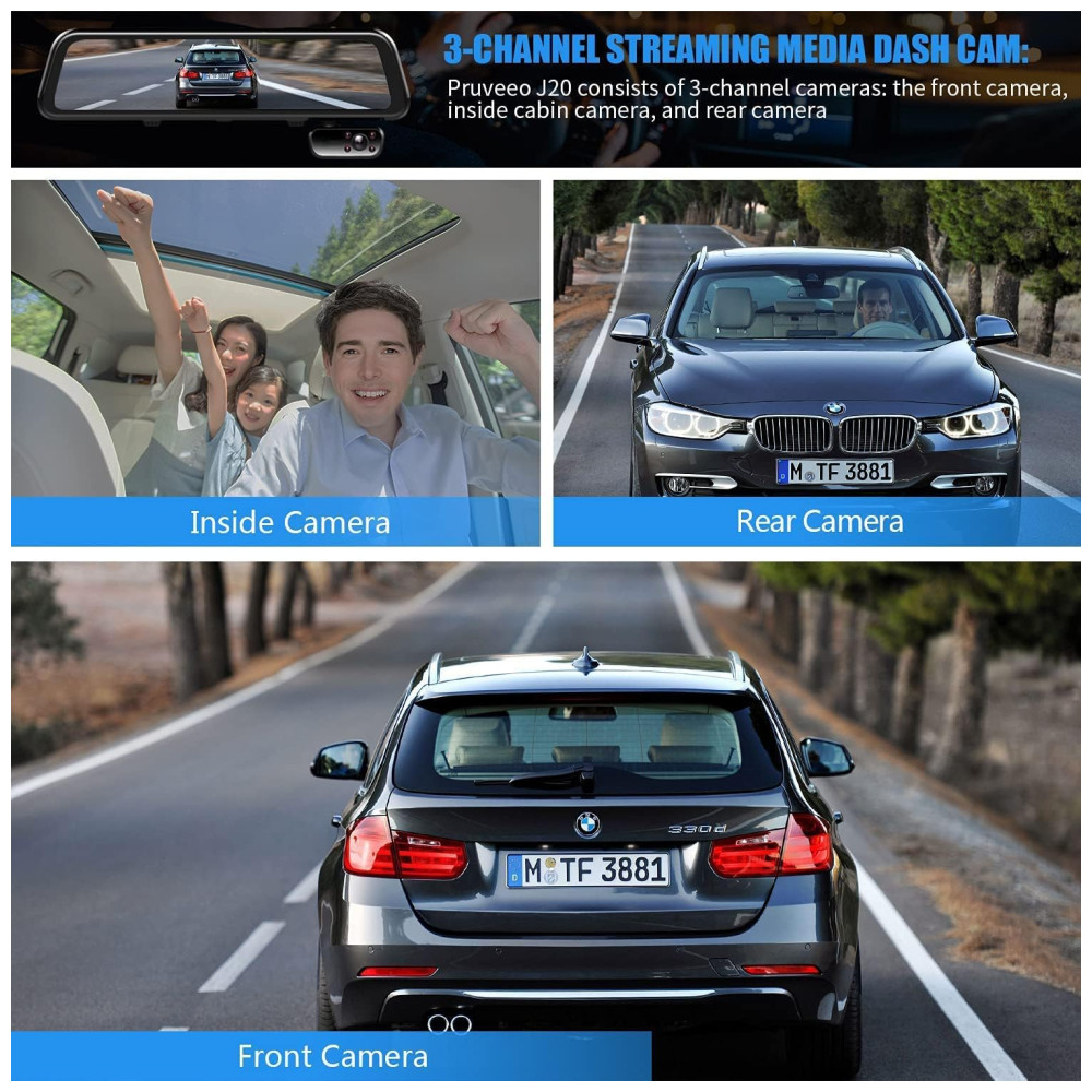 Triple Mirror DASH CAM STREAMING MEDIA DASH CAM consiste em câmeras de 3 canais a câmera frontal, a câmera interna da cabine e a câmera traseira, que grava vídeo simultaneamente em FHD 1080P. Ao contrário do espelho retrovisor tradicional, que tem um campo de visão estreito e área cega, Pruveeo J30 Dash Cam é instalado no espelho retrovisor tradicional por meio de cintas. Ele vem com uma tela de toque HD IPS de 12 polegadas para exibir as visualizações de três câmeras em tempo real, tornando a direção mais segura e o estacionamento mais fácil.