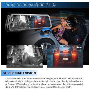 SUPER VISÃO NOITE A câmera interna da cabine vem com 4 luzes infravermelhas, que podem ser ligadas e desligadas automaticamente de acordo com a luz ambiente. À noite, o recurso de visão noturna do Pruveeo J30 pode capturar claramente toda a cabine, mesmo quando a cabine está completamente escura, e a rotação de 320 torna conveniente ajustar o ângulo de disparo.