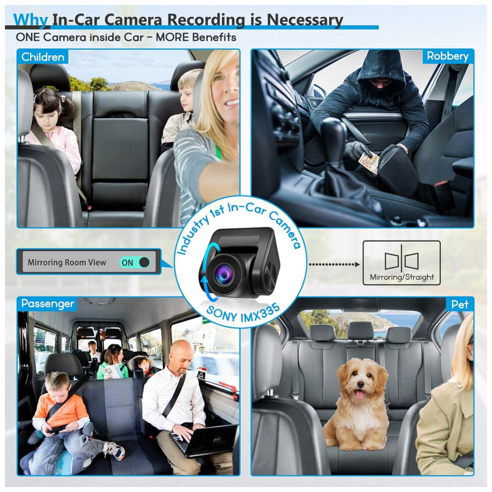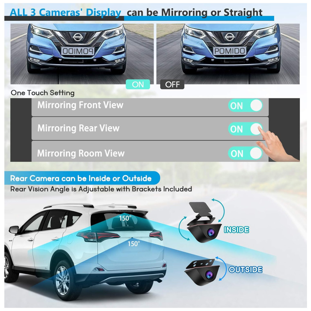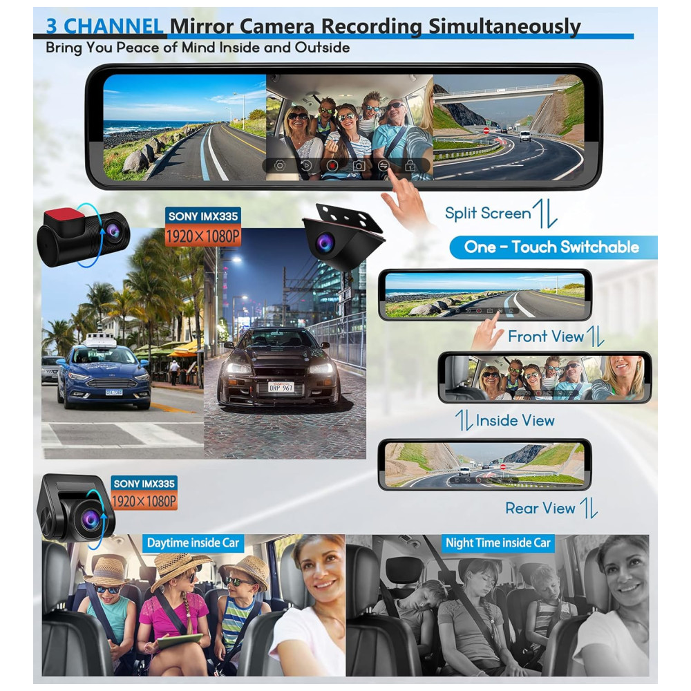 Câmera com espelho HD FIRST de e 3 canais Câmera com espelho retrovisor triplo PORMIDO gravando a visão traseira, frontal e interna do carro simultaneamente, dá lhe paz de espírito dentro e fora do seu veículo, você pode alternar para qualquer visualização que preferir. Com a câmera interna, você pode monitorar crianças, passageiros, animais de estimação ou até mesmo capturar ladrões para proteger sua propriedade.