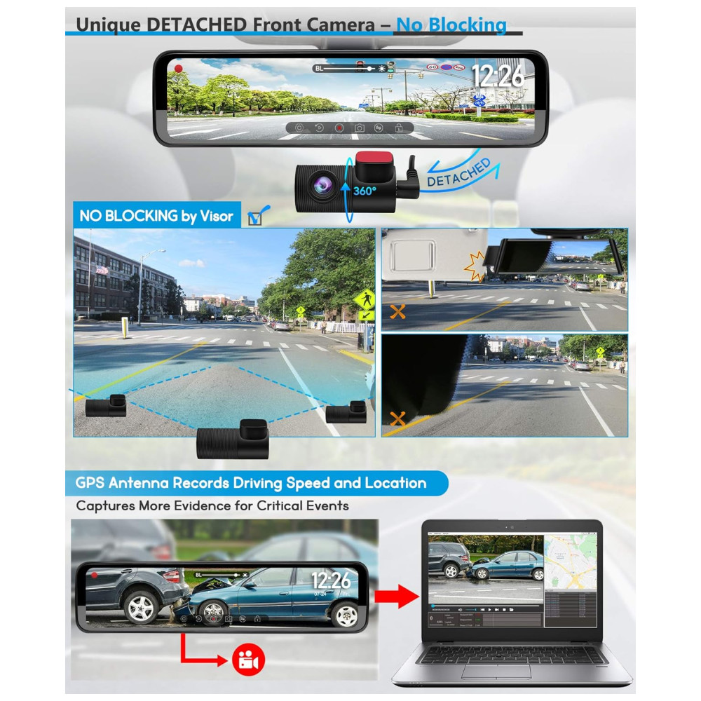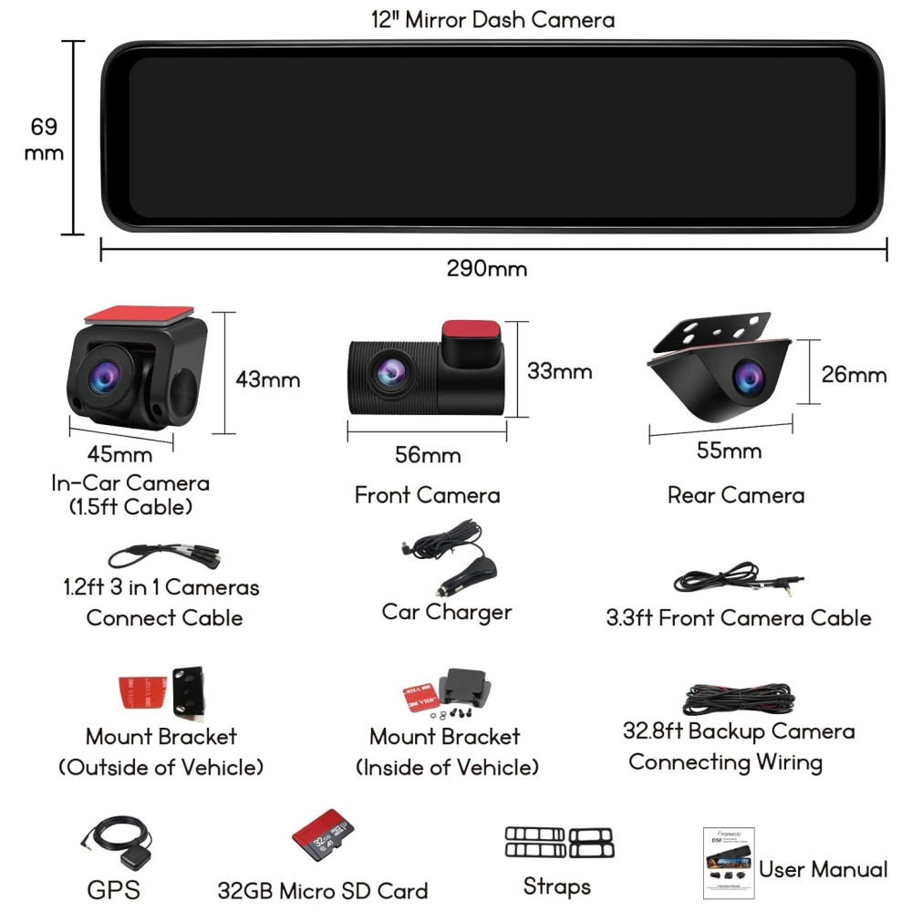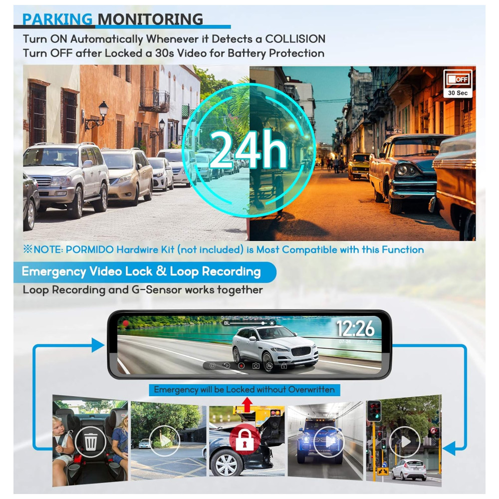 Rastreamento GPS e funções múltiplas A antena GPS incluída pode adicionar velocidade de direção, rotinas e locais aos clipes gravados para evidências adicionais. Você pode obter TODAS as funções necessárias da câmera de backup de espelho PORMIDO, como monitoramento de estacionamento, gravação de loop, sensor G, tela dividida Display etc, ele suporta cartão de memória de até 128 GB cartão de 32 GB incluído