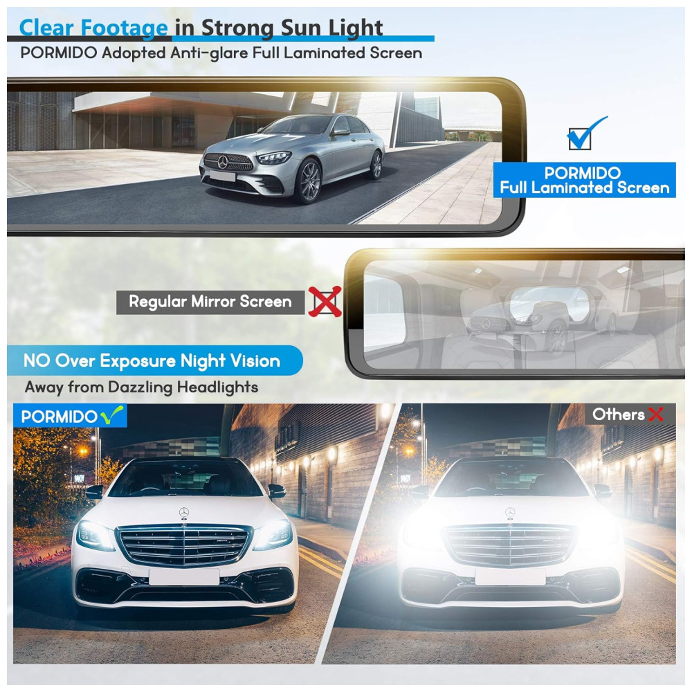 Antirreflexo e sem superexposição Diferente da maioria das câmeras de espelho, o espelho da câmera do painel PORMIDO adota uma tela antirreflexo totalmente laminada exclusiva, traz a você a melhor imagem mesmo sob luz solar forte. Com o sensor Sony IMX335 em tecnologia HDR em todas as lentes, a imagem ou o vídeo NÃO será superexposto por outros faróis, você pode ver cada placa claramente na visão noturna com uma direção segura.