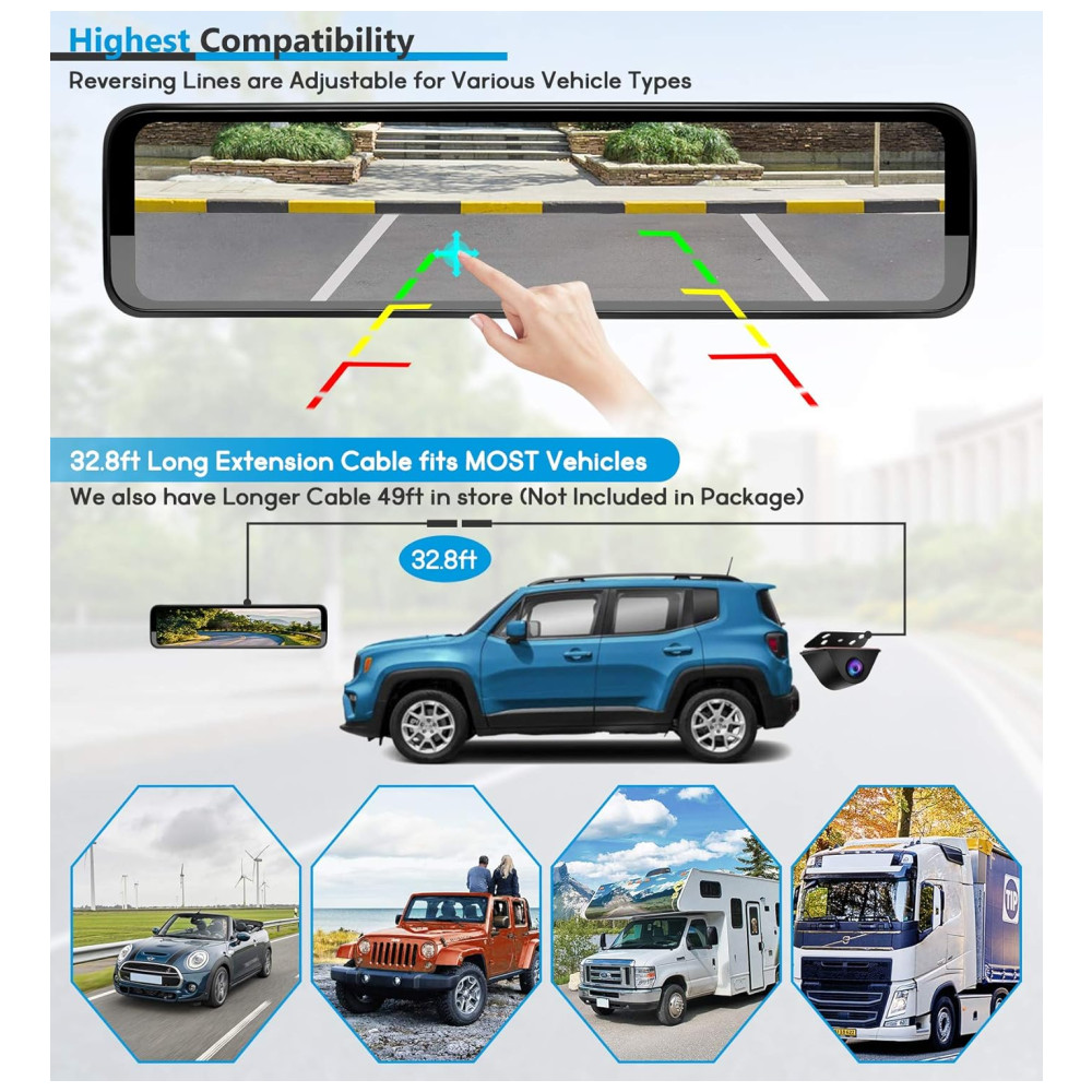 Linhas reversas ajustáveis e fio de extensão mais longo Você pode ajustar as linhas reversas para caber em todos os modelos, o cabo da câmera reversa de 10 m é longo o suficiente para a maioria dos carros. Você também pode solicitar um cabo extra da câmera traseira de 14 metros não incluído para caminhão grande, trailer , RV, motorhome, pickup, van … etc, entre em contato conosco se o fio incluído ainda não for longo o suficiente para você.